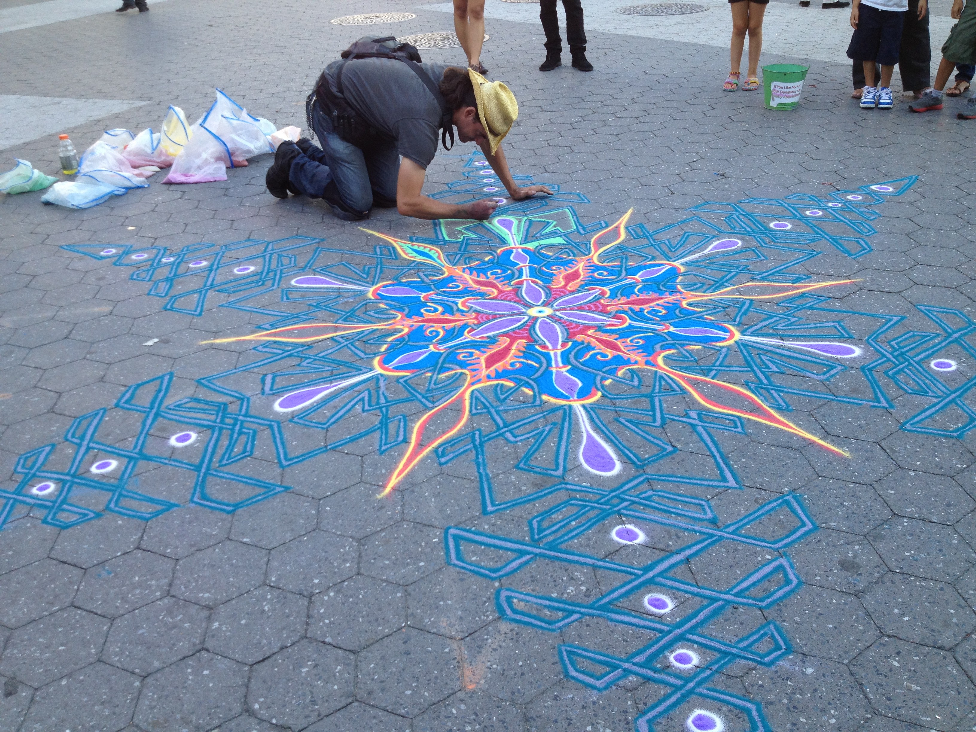 Oborožen z vrečkami barvnega peska se Joe Mangrum zadnjih nekaj let sprehaja po mestnih ulicah in z njim ustvarja neverjetne vzorce. Vsaka njegova umetnina je popolnoma spontana in se zgodi v trenutku navdiha. Za njo potrebuje med šest in osem ur, sicer pa umetnik ocenjuje, da jih je do sedaj ustvaril že približno 550.