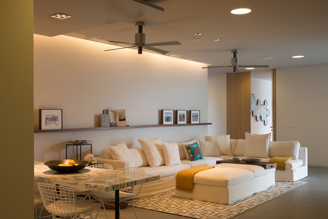 Pohištvo in dekorativni elementi pa so izključno izbrani ter oblikovani za integracijo z arhitekturo. Barve in tkanine prinašajo toplino ter sproščujoče vzdušje v hiši na plaži, medtem kot pohištvo po meri spominja na sredino stoletja ter se odlično dopolnjuje s starinskimi elementi.