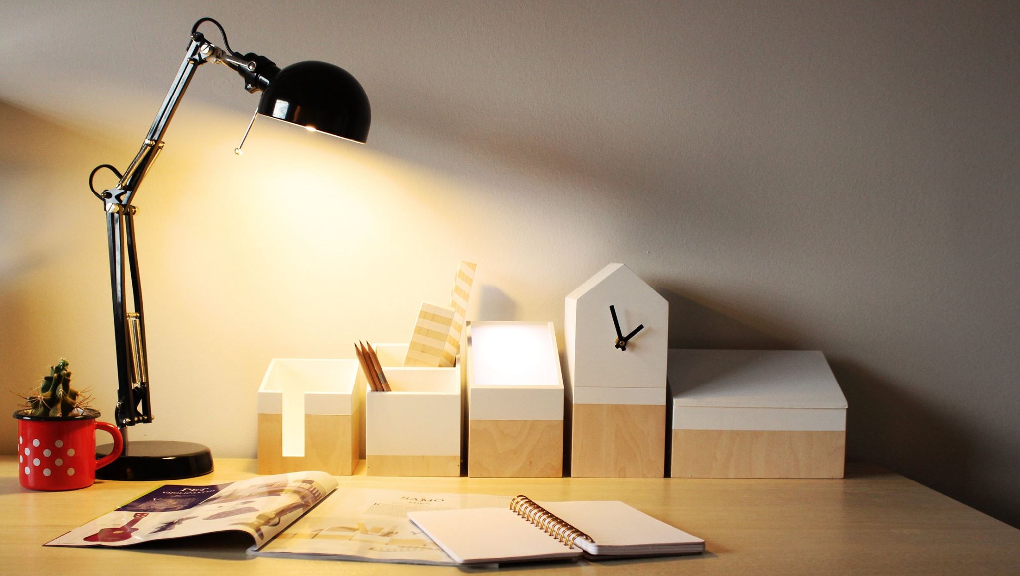 Na posledním Pop-up domů k vidění byla i kolekce kancelářských potřeb Desk kamarádi, sada pěti dřevěných prvků, které po umístění na stůl umožňují organizaci a estetické uspořádání široké škály kancelářských potřeb doma i v pracovním prostředí. Stylový podpis nese čistý design, který k funkčnosti přidává estetickou složku. Sada se skládá z pěti ručně vyrobených jedinečných „badiho": hrnec na poznámky, hrnec na pera, ambientní světlo, krabička na hodiny a krabička na drobné příslušenství. Produkt podepsali studenti Fakulty designu, Petra Božič a Živa Lutmanová.