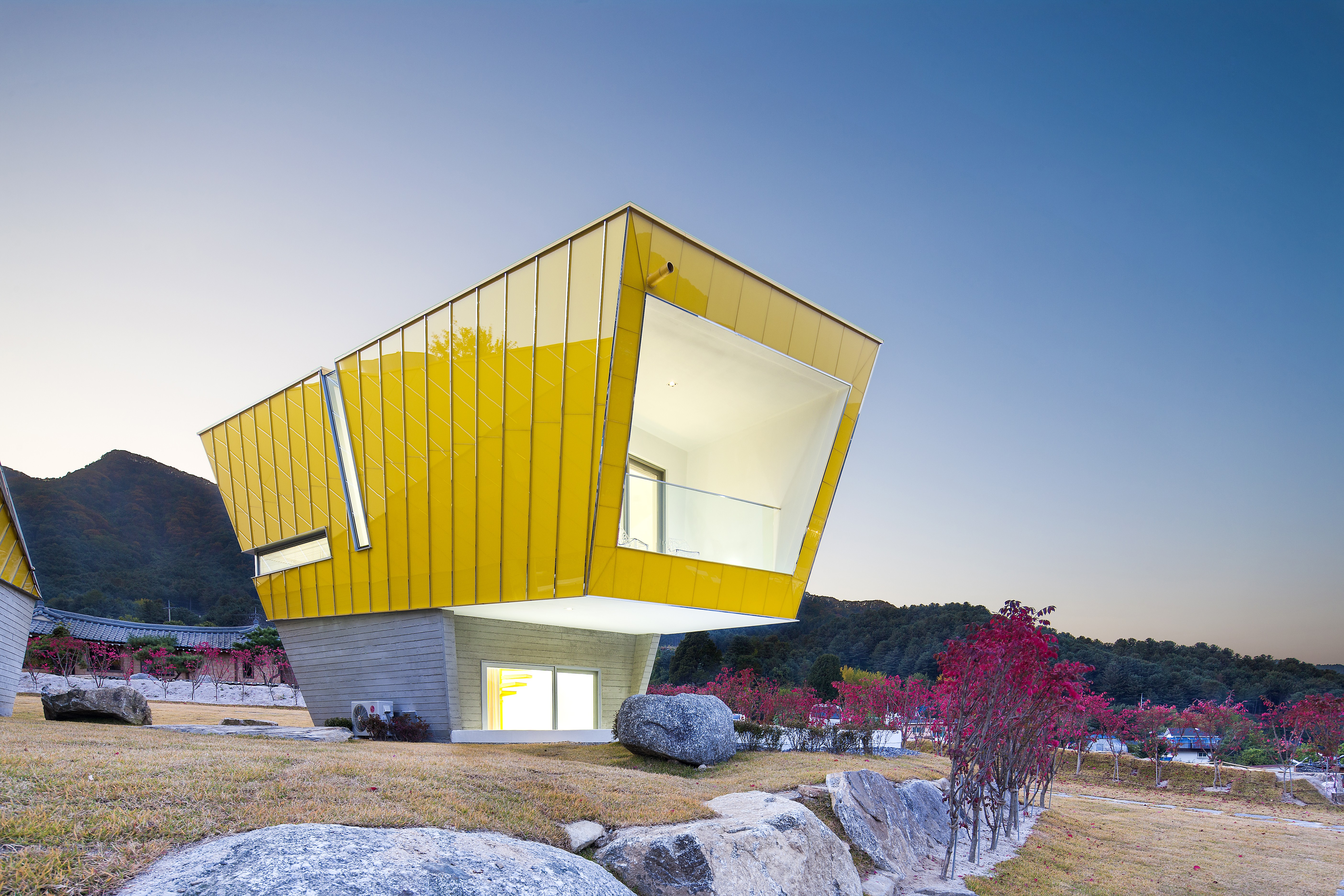 Krajina kousek za Soulem odhaluje malou osadu moderních víkendových domů - jasně žluté domy. To bylo postaveno pro ubytování hostů určených pro nedaleký Morning Calm Botanical Park. Korejské architektonické studio Koossino, pověřené architektonickým návrhem, našlo inspiraci v tajemných sochách Moai, díky nimž je Velikonoční ostrov na seznamu světového dědictví UNESCO.