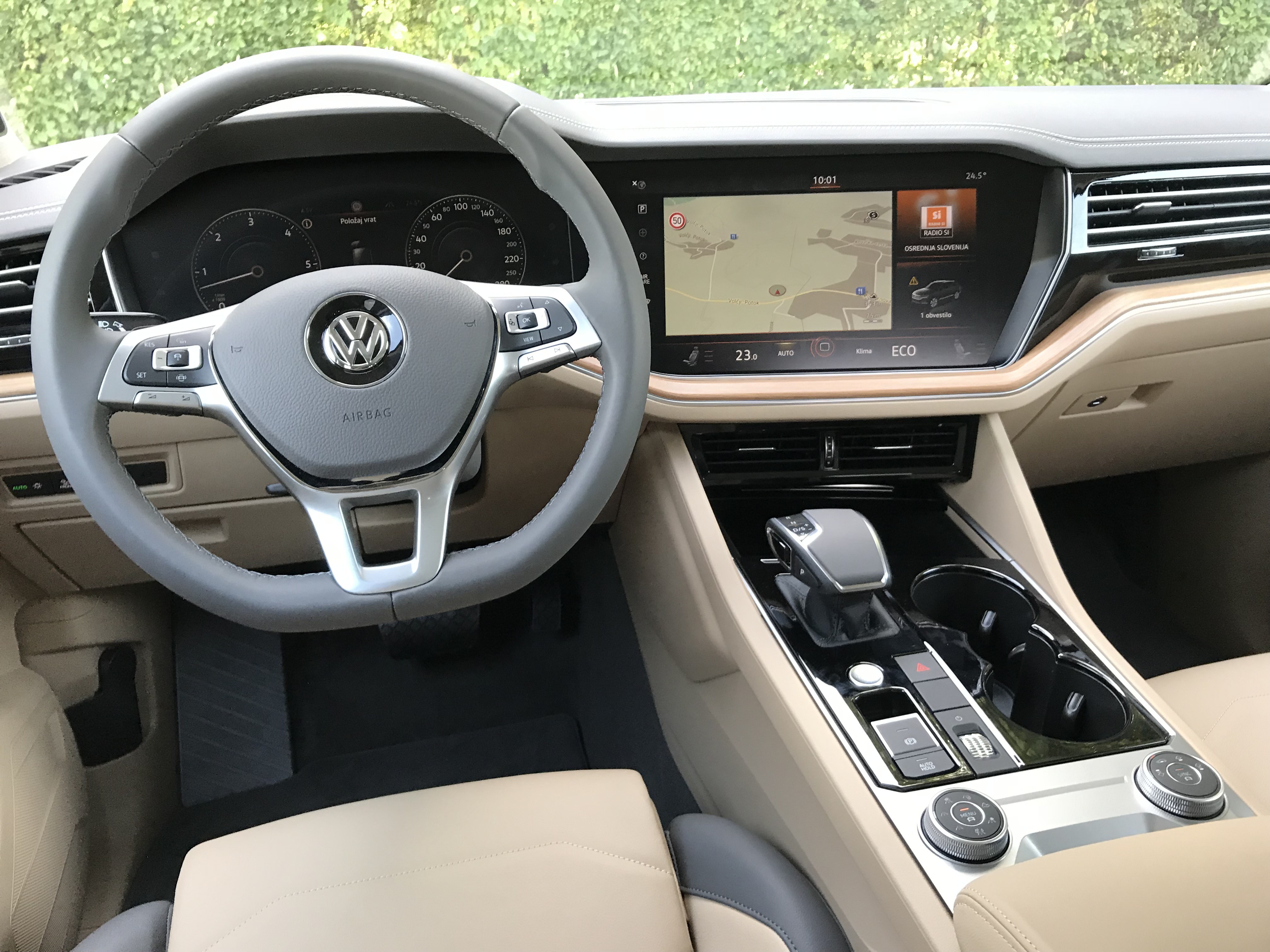 Notranjost ne samo, da ima na voljo prestižne materiale, kot sta dřevo a brušena kovina, temveč je skorajda popolnoma digitalizované v obliki intuitivnega zaslona na dotik. Pred voznikom imamo digitální metrů ve velikosti 12,3 palce in poleg njega osrednji zaslon v velikosti 15 palcev, prek katerega upravljamo s klimatsko napravo, navigacijo, radiem in ostalimi nastavitvami. Touareg ima serijsko nameščene VEDENÝ-světlomety, ki jih lahko nadgradimo z matričnimi VEDENÝ-světlomety, med ostalo tehnologijo pa najdemo še zračno vzmetenje, 4-kolesno krmiljenje, aktivni elektromehanski stabilizator nagiba in kopico asistenčnih sistemov.