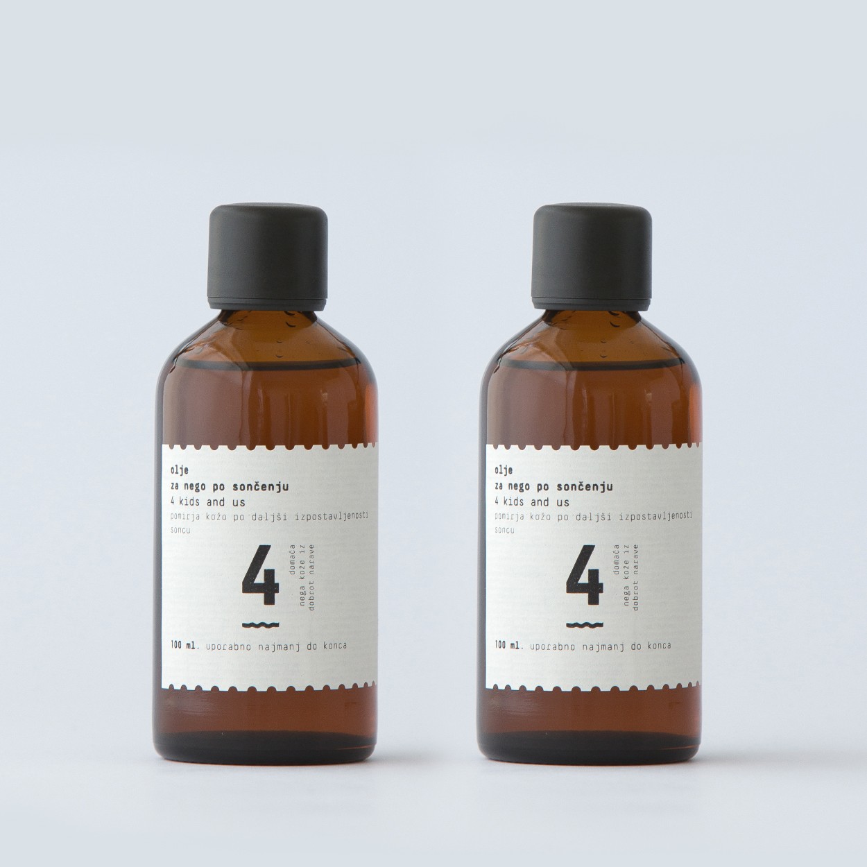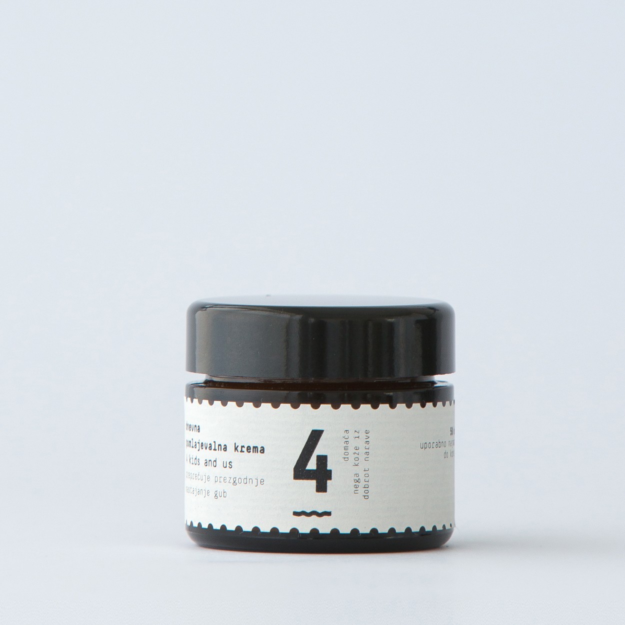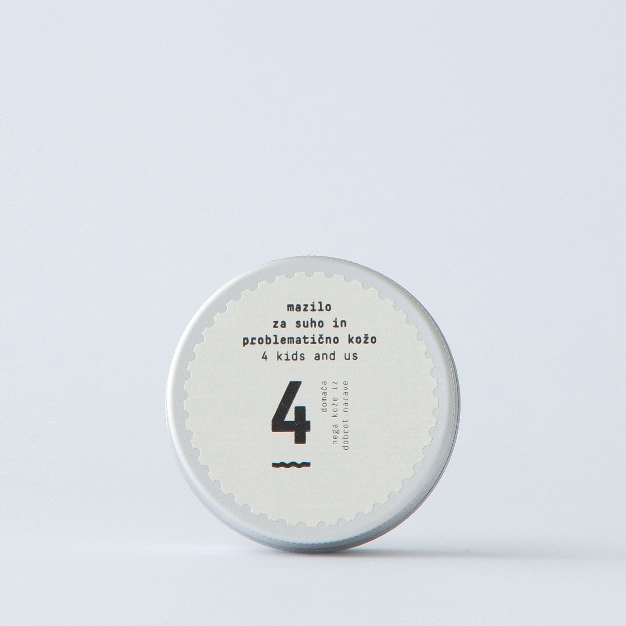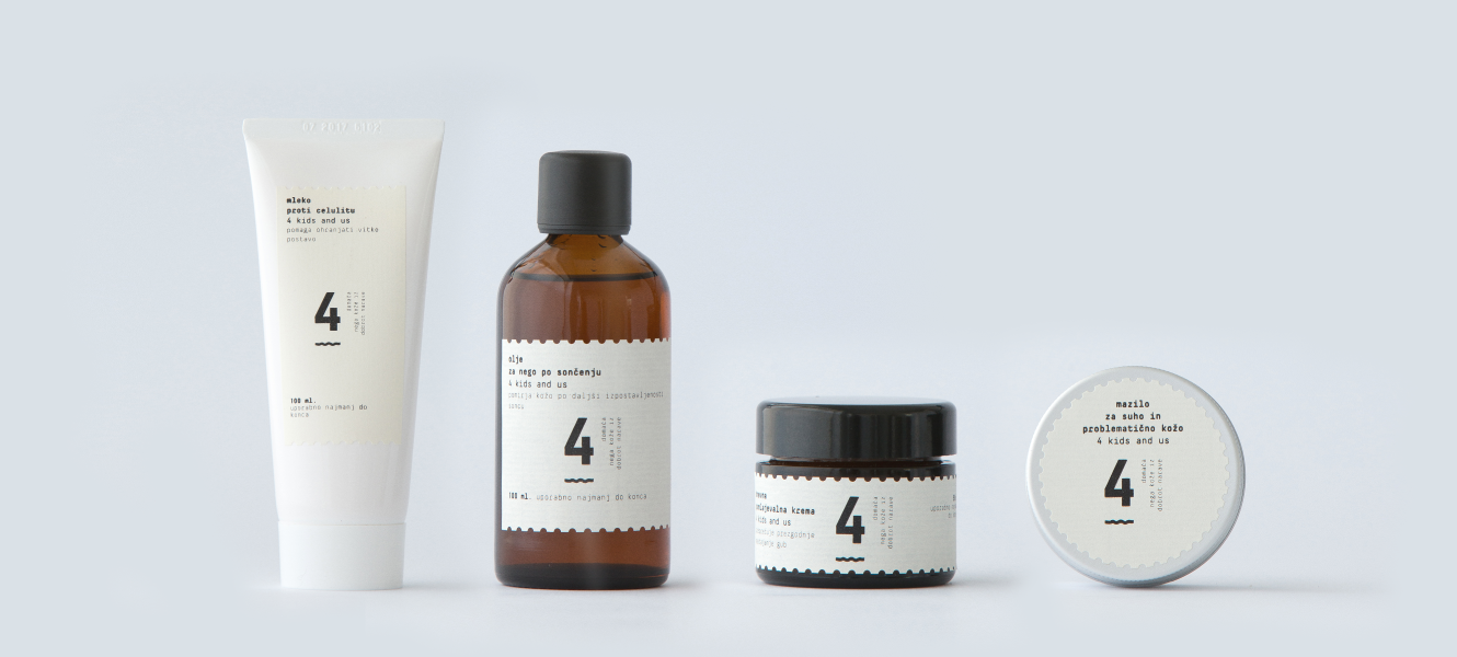 4 kids and us er et helt frisk slovensk mærke af naturkosmetik, der kom på markedet i midten af september. Bag den står firmaet Rainer Kozmetika, ledet af mand og kone Vanja og Jure Rainer, forældre til fire børn. Upåklagelige naturlige hudplejeprodukter er lavet af biprodukter, Carnivoran lavendel fra lokal produktion og urter dyrket på traditionel vis. Sæber, olier og salver er velegnede til både børns og voksnes hud.