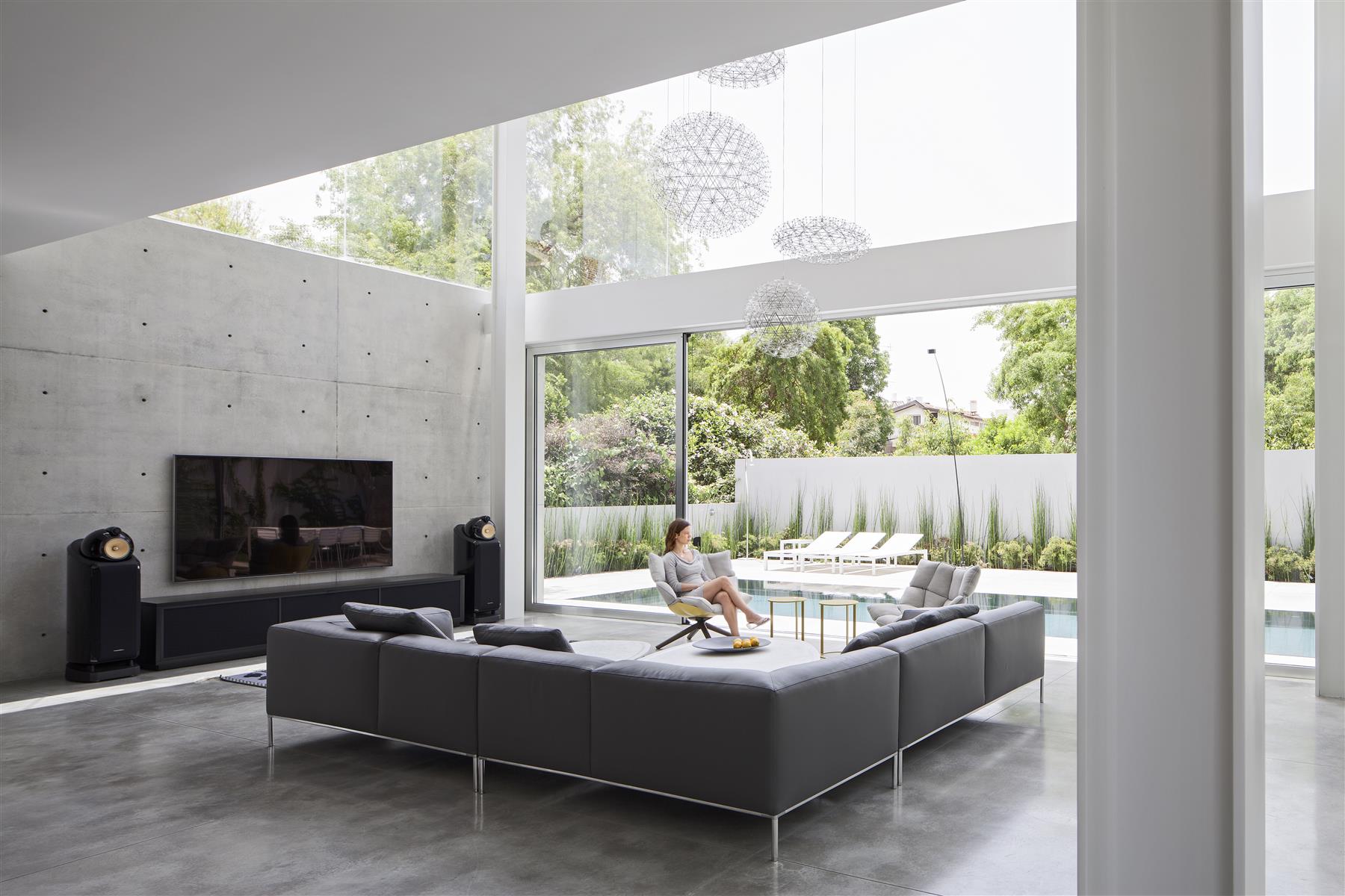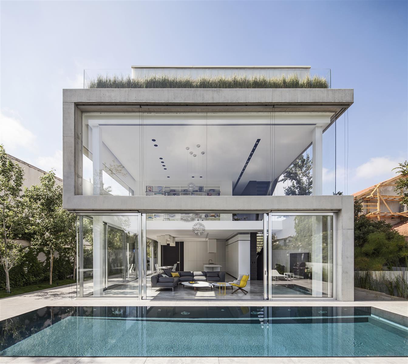 Det moderne familiehus Concrete Cut House i Tel Aviv består af rektangulære prismer stablet oven på hinanden, og mellem dets glaspaneler en endeløs række af betonslanger som en slange. Deraf navnet på dette luksuriøse hjem af raffineret design, som trækker farver fra det ydre miljø.