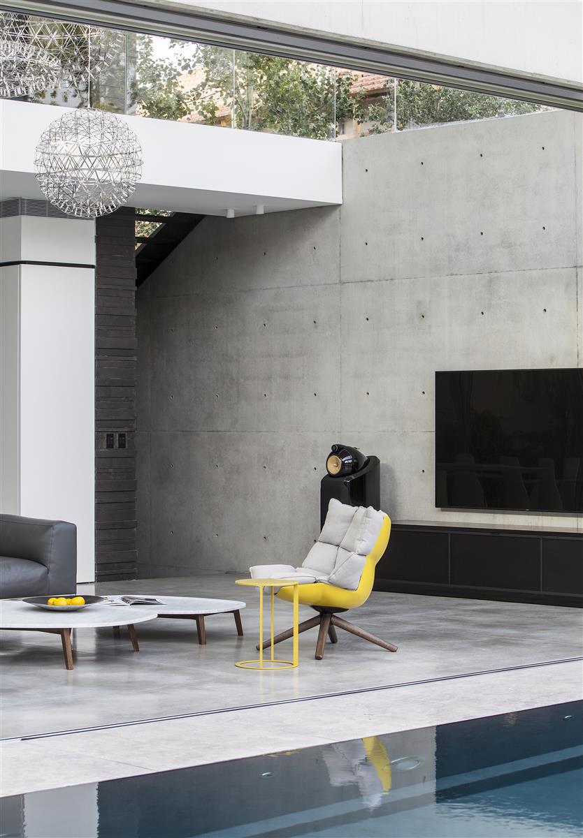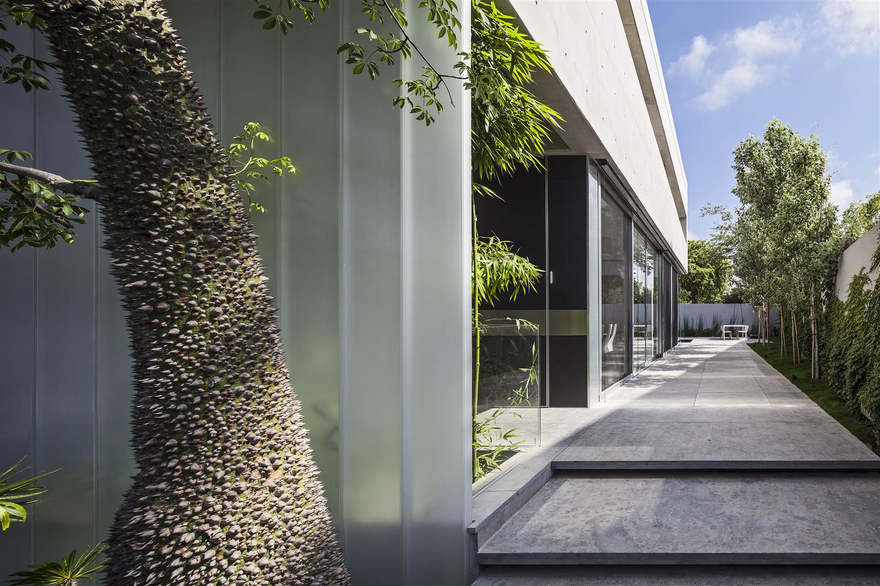 Glas-beton kombinationen byder på forskellige niveauer af privatliv, for mens dette to-etagers hus på sydsiden spiller "nudist", er det på nordsiden et rent "tangle". Foran stuen og lige bag panoramaskydevæggene er der en skøn blomstring udendørs pool, og på øverste etage er der soveværelser og et skab. Den "offentlige" trappe fører til den øverste etage, som de eskorterer glasplader indstøbt i beton, og alle rum er klædt i minimalisme fra top til tå. Farve ind monokromatisk atmosfære indendørs planter og individuelle møbelelementer introduceres, mens den stramme minimalisme også opblødes af de grønne udendørs omgivelser.