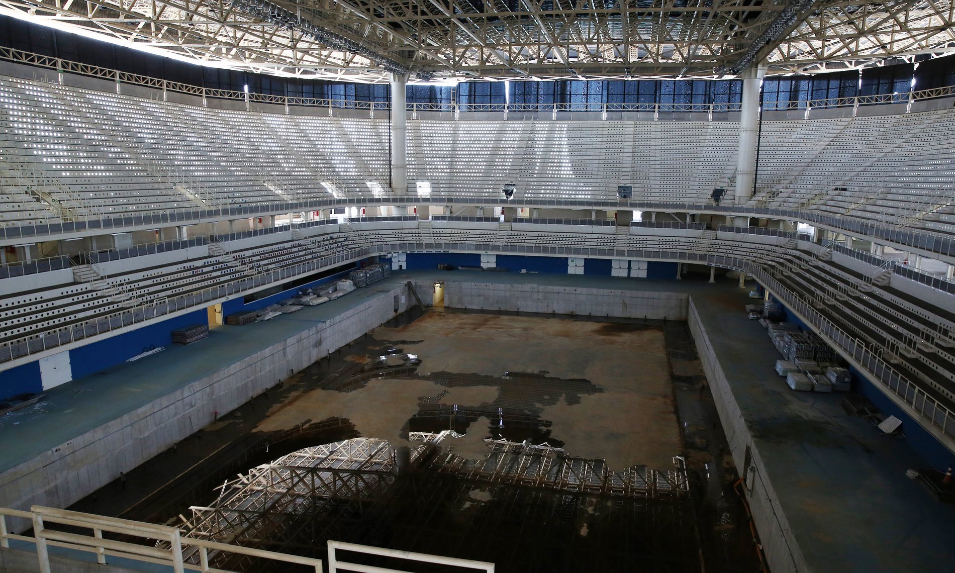 Maracana, som blev renoveret to år før fodbold-VM-spil for 470 millioner euro, blev skændet af vandaler, de eneste besøgende på stadion er herreløse katte (stadionets desperate tilstand skyldes primært striden mellem arrangørerne af de olympiske lege og firmaet, der administrerer det), de olympiske svømmebassiner er blevet vandfyldte , olympiske landsby og det blev en spøgelsesby. En investering på næsten en milliard euro leder efter købere og er praktisk talt tom, da de kun har solgt 260 ud af 3604 lejligheder.