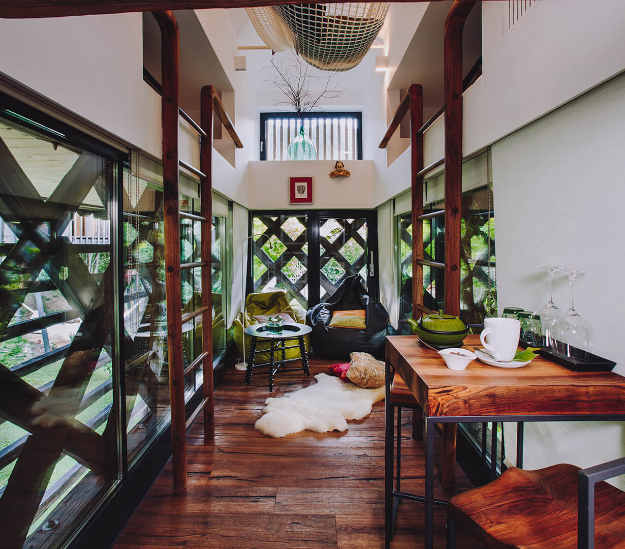 Kozolec inviterer alle, der ønsker at være anderledes, komfortable, sameksisterende med naturen. Selvom det ser ganske almindeligt ud udefra, gemmer det på en ekstraordinær stemning. Glaskonvolutten giver en vidunderlig udsigt over floden Savinja og Breznicas vilde klippehøjde.