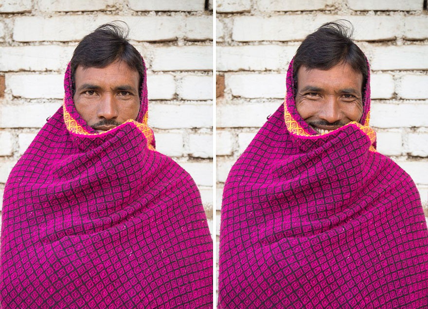 Du kender ideen – et smil koster dig ikke noget, men du kan lysne en persons dag op med det. Jay Weinstein oplevede også den utrolige kraft af et smil på sin egen hud, da han engang ville fotografere en mand på en togstation i Indien, men da han bemærkede hans skræmmende blik, rettede han linsen et andet sted hen. Så råbte manden for også at tage et billede af ham. ''Smil,'' bad Weinstein ham, og hans alvorlige udtryk blev til et varmt og glødende smil. Dette øjeblik inspirerede fotografen til at starte sin serie af portrætter af fremmede, så jeg bad dem om at smile.