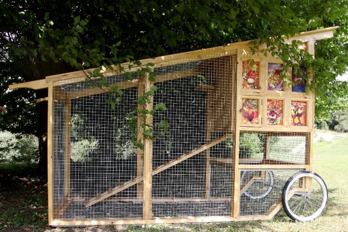 Kravet om at opdrætte kyllinger i bymiljøer gav anledning til ideen om at bygge et hønsehus. Den er lavet af enkle materialer: aluminium, træ, metalnet og to hjul på størrelse med en vintage pony.