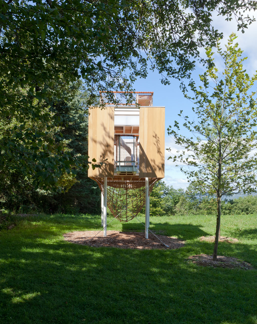 Tegnestuen Sharen Davis Design har bygget et 'træhus' til mange formål på en gammel gård i Garrison (NY), som grundlæggende er en moderne legeplads for børn, hævet fra jorden og placeret mellem høje træer.