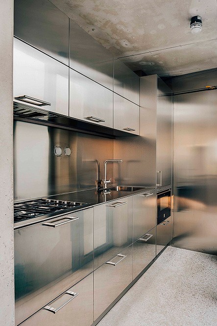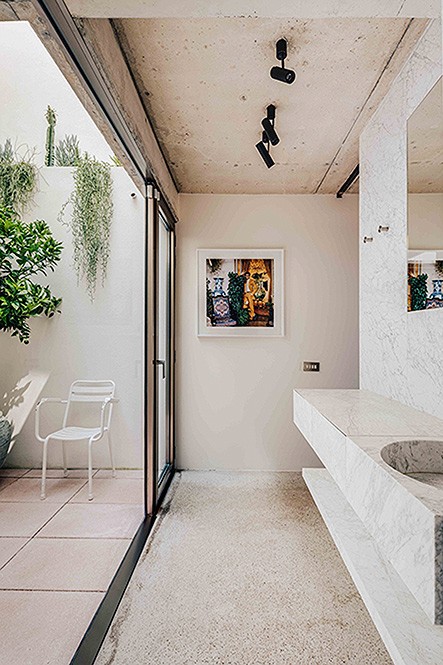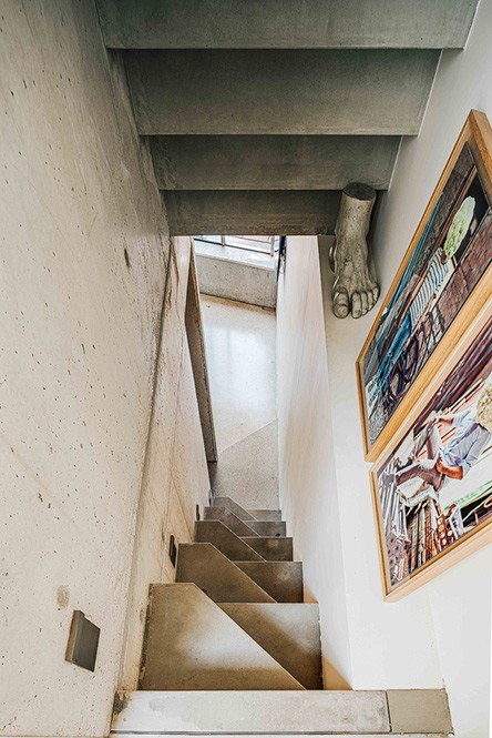 Arkitekten Barbara Appolloni "skulpturerede" en oase af beton og glas fra den tidligere garage. Den originale bygning er designet i denne "skoæske"-stil, hvor arkitekturen bliver en del af indretningen, hvilket resulterer i virkelig moderne opholdsrum.