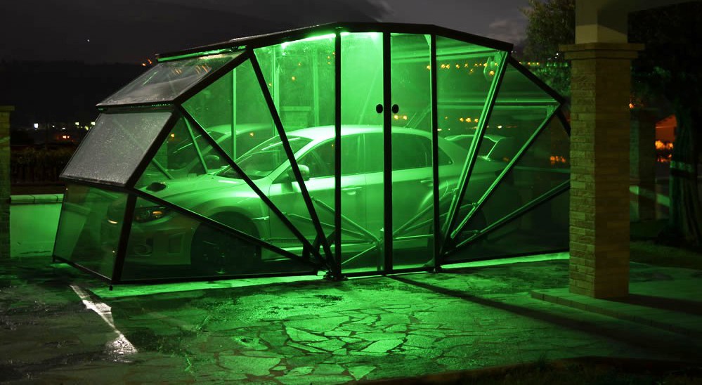 GazeBox det er sammenklappelig garage som du ikke behøver byggetilladelse til, og hvis du ikke har til hensigt at opbevare en bil i den, kan du bruge den som haveskur eller overdækning. GazeBox i glas beskytter bilen med specielle UV-bestandige polycarbonatpaneler, som tilbyder beskyttelse mod alle vejrforhold på samme tid de holder ikke på varmen (selvudluftningssystem).