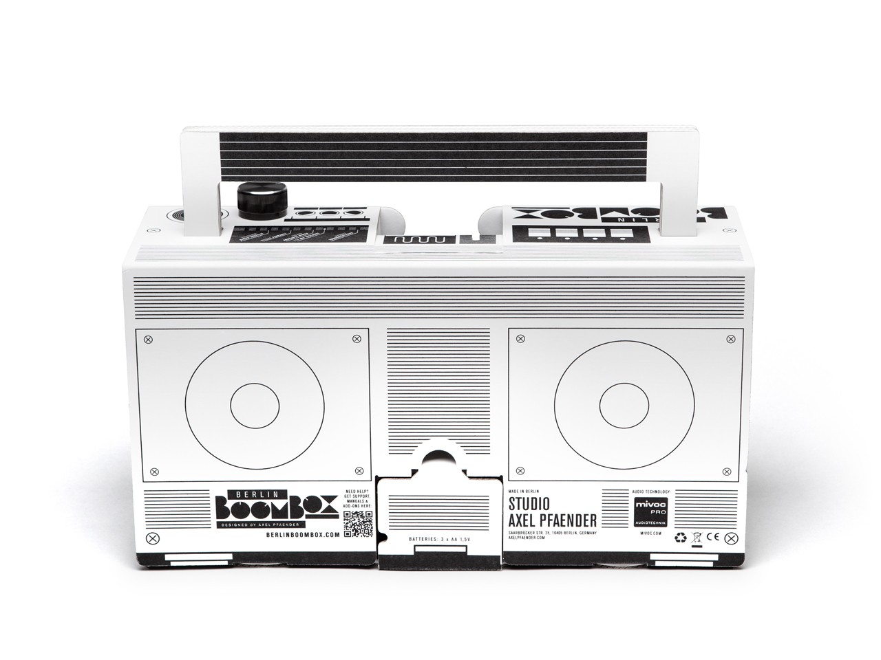 De sort-hvide grafikelementer er trykt på robust bølgepap af høj kvalitet, som medfølger i sættet sammen med et stærkt håndtag til at bære radioen. Vi har brug for tre mere AA batterier til Hi-Fi-højttalere og to 5-watt forstærker.