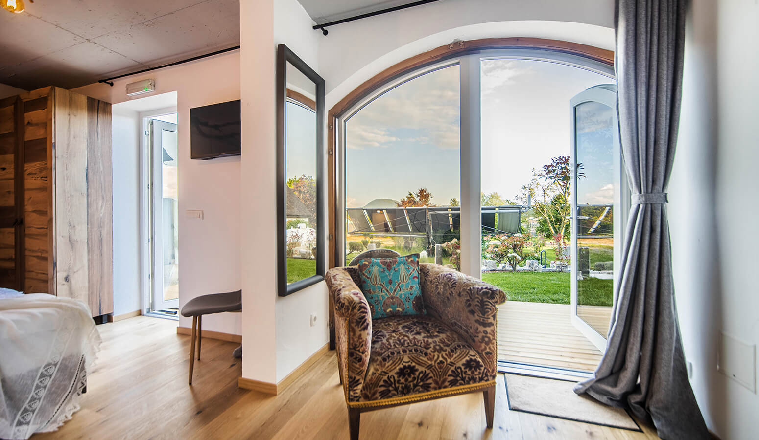 Prava paša za oči so elegantno opremljene sobe, ki gostom nudijo oddih v udobju najboljših materialov in izbranega pohištva. Pri oblikovanju so upoštevali vidik trajnosti in izbrali le naravi prijazne materiale. Najbolj razkošna je suita z edinstveno opremo, ki goste nenehno preseneča. V središču sobe je zasebni bar, ki se razprostira pod 250 let starim lesenim stropom.