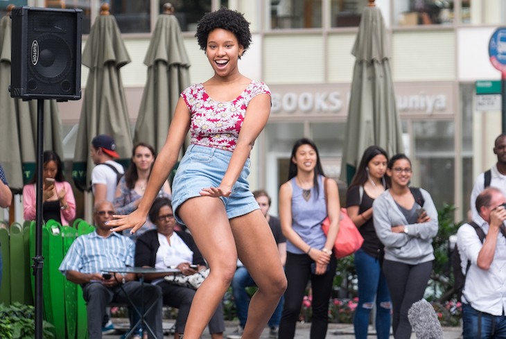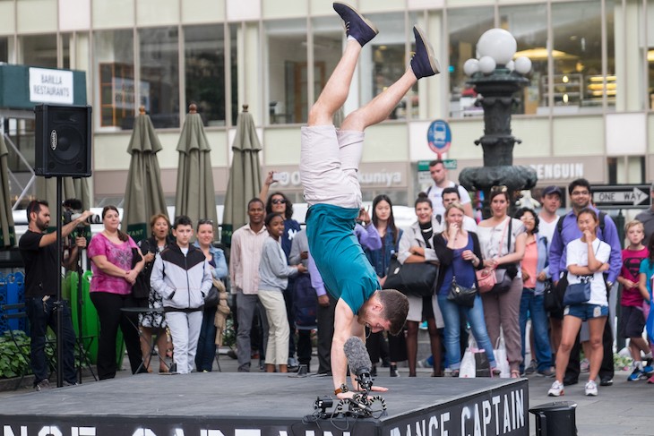 Flash mob holdet Improv overalt er midt i en New York park (New York betragtes som fødestedet for flash mob) oprettet en scene og 100 danseresom ventede på, at han skulle træde på piedestalen tilfældige forbipasserende og viser dem til rytmen af baggrundsmusikken dansebevægelser, som de skal gentage som papegøjer.