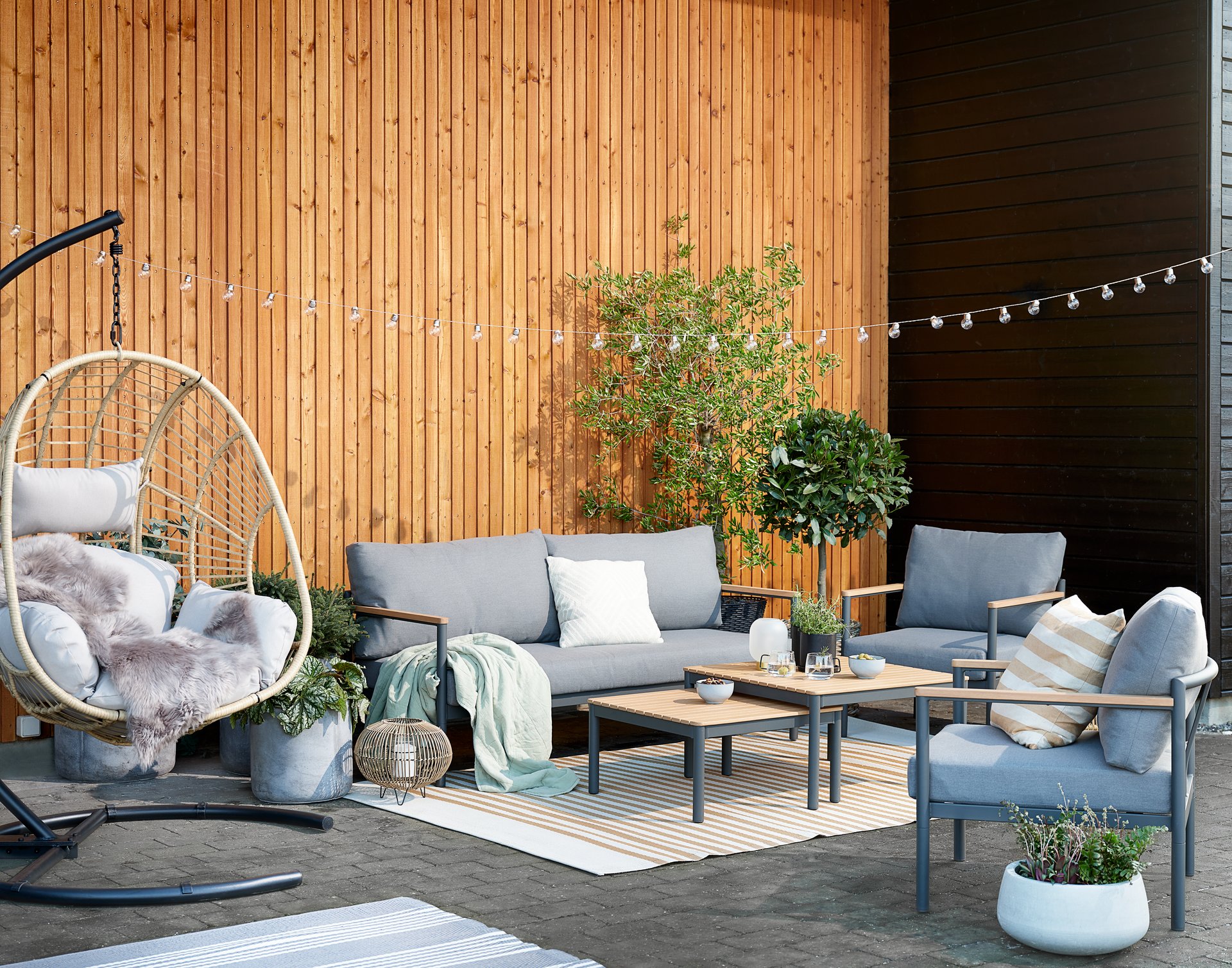 Den nye JYSK kollektion af udstyr til terrasser og altaner lægger vægt på træ, som får en blødere, blidere form ved at bruge genbrugsmaterialer. Overvægten af håndarbejde med en udtalt struktur og et populært håndværkerlook på skandinavisk vis er genkendelig.