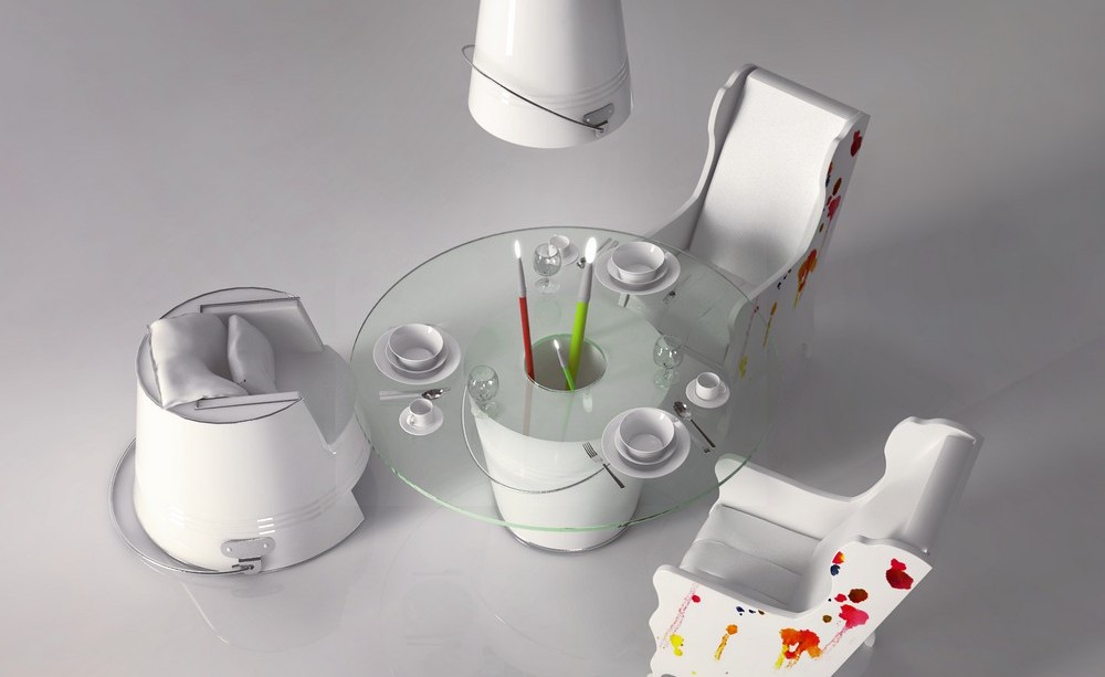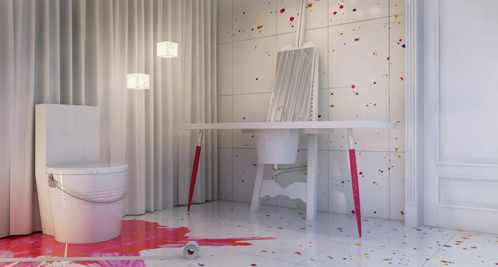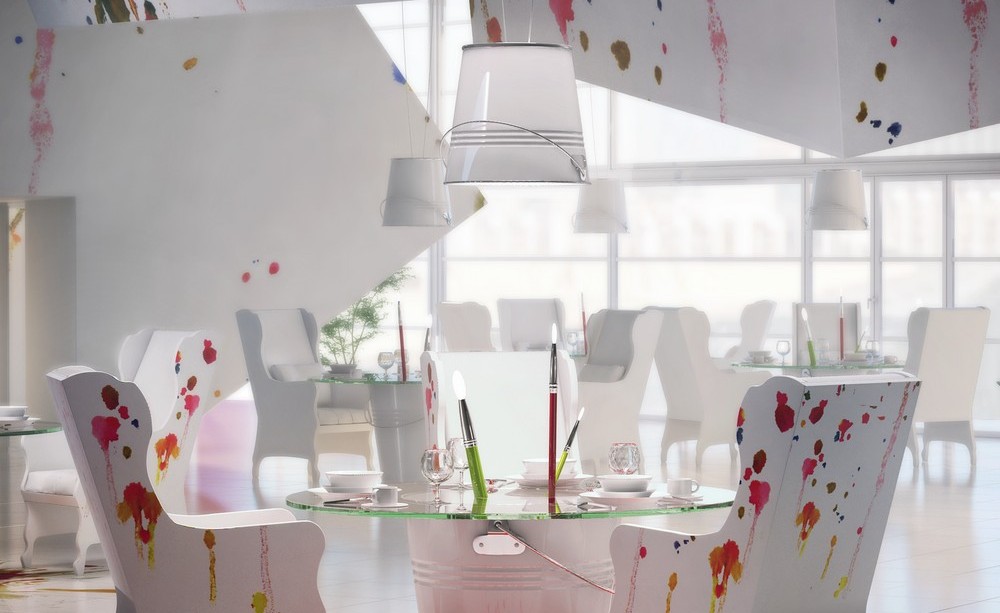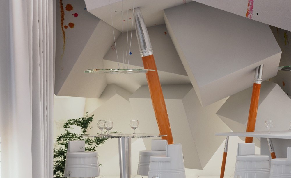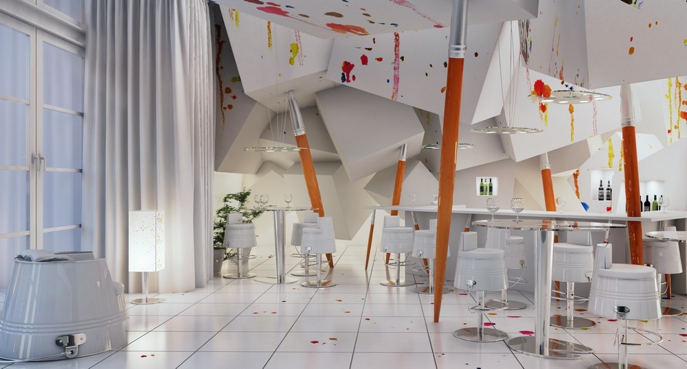 Kæmpe pensler for eksempel tjener de som søjler, enorme malerpaletter som lamper og spande som stole. Loftet er dekonstrueret ved hjælp af hvide terninger, der på en eller anden måde hænger over rummet, og metalmøbeldetaljer bringer lidt af futuristisk åndBadeværelserne er også indrettet i samme stil. Den friske, let komiske tilgang til designet transporterer den besøgende ind i en malers ateliers fantasiverden.