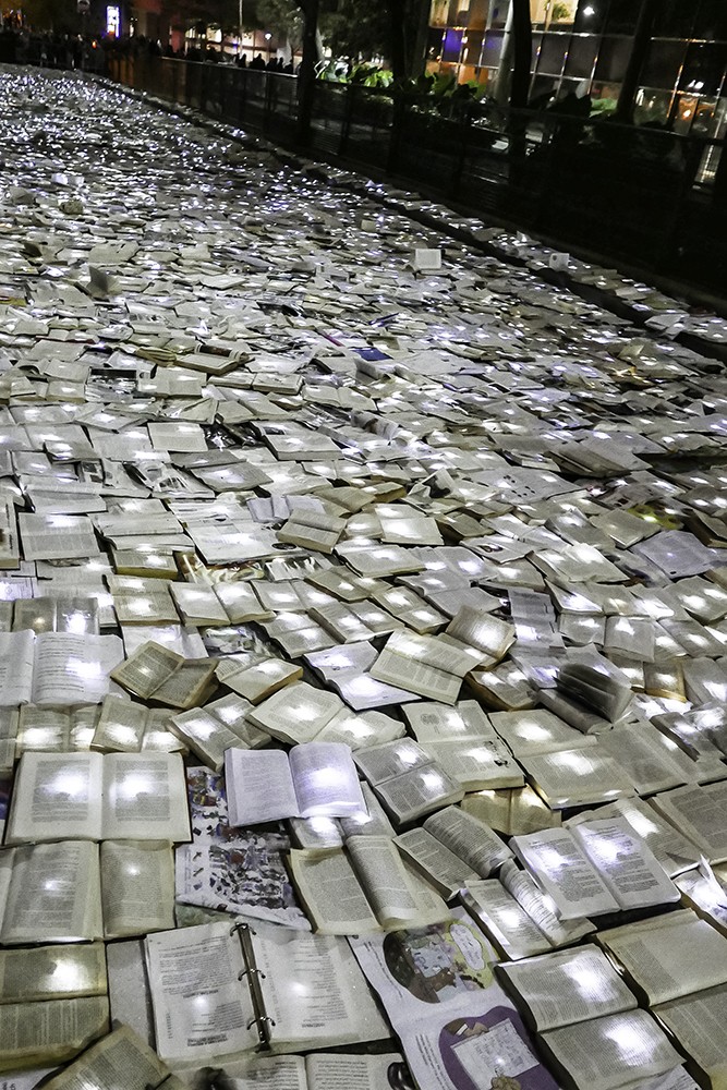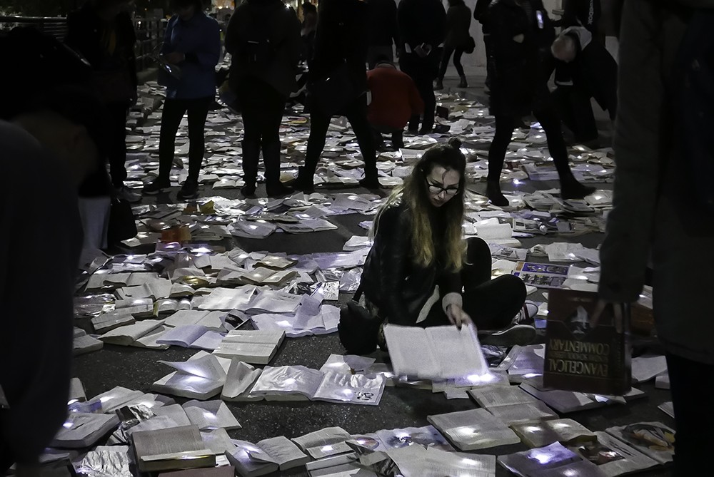 Tilfældige forbipasserende blev mødt af en usædvanlig scene på Hagerman Street i Toronto. Luzinterruptus, en anonym kunstgruppe fra Spanien, som er berømt for indgreb i offentlige rum (svarende til vores Prostoroževka), dækkede gaden med ti tusinde bøger!