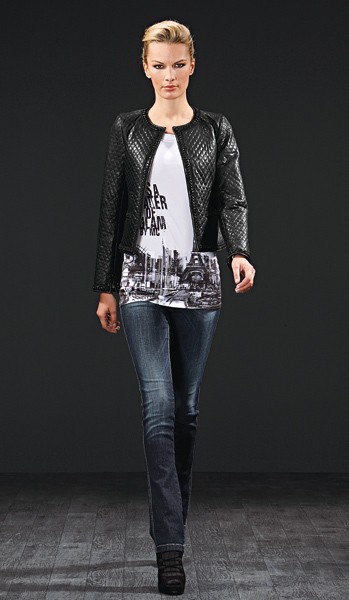 Kolekcija Marc Cain za jesen in zimo je tako raznovrstna kot izredno sinhrona. Oblike so izredno ženstvene in glamurozne, ustvarjajo tako imenovani “power look”. Tema je plastenje. Kratke prešite jakne s šivi in verigami spominjajo na ikono klasičnega stila Coco Chanel in se popolno ujemajo z modernimi dolgimi topi, oprijetim jeansom in visokimi petami. Poudarjena ramena na blazerjih in jaknah dodatno poudarjajo ozko silhueto. Vsestranskost je nujen del kolekcije. Zadrge niso uporabljene le kot dekoracija, temveč presenetijo s funkcijo izredno kreativnega načina. Škornji, ki segajo čez kolena, razkazujejo dolge noge in so nujen kos za zimo. Bela kontrastno sodeluje s črno, močna vijola in poželjiva zelena pa nekoliko poživita barvno paleto. Verige in kovice so tam zato, da povečajo “glam” faktor. Ameriško-italijanska moda par excellence!