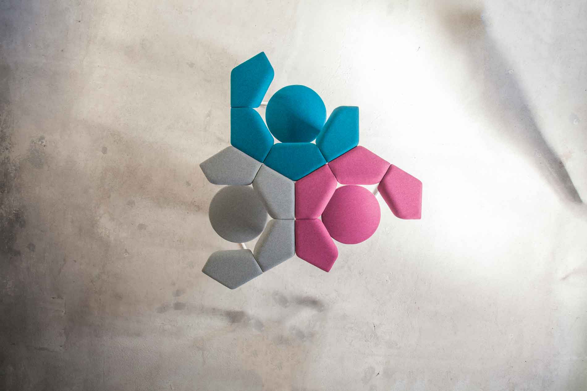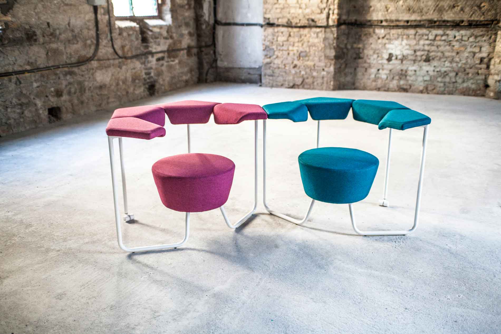 Flyde det er multifunktionelt sæt af modulære stolesom tilsammen skaber et ideelt arbejdsmiljø for SamarbejdeHver for sig er de “bare” komfortable stole med polstrede ryglæn, men når man sætter dem sammen, skaber de en arbejdsflade og en følelse af som om vi ryster på hovedet og roder hjernen ved et sofabord.