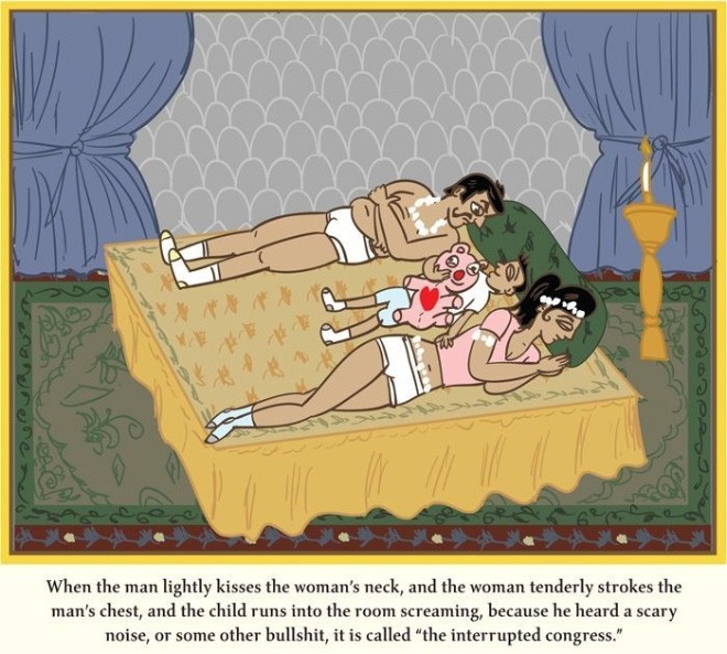 Forfatter sta se izjemno simpatično poigrala s tegobami zakonskega staža in iz tega naredila izjemno duhovito serijo ilustracij, ki bazirajo na “karaterjih” starodavne indijske knjige o Kamasutri.