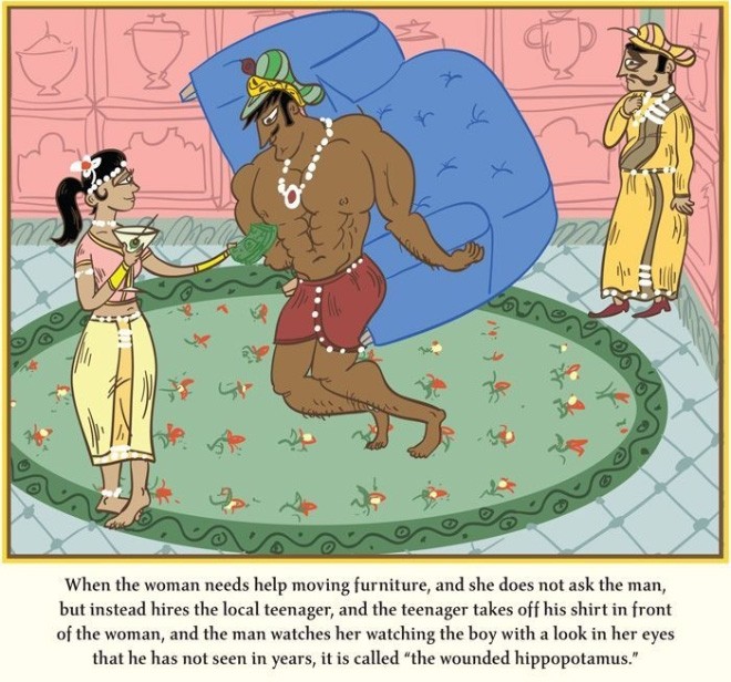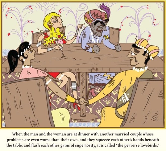 Forfatter sta se izjemno simpatično poigrala s tegobami zakonskega staža in iz tega naredila izjemno duhovito serijo ilustracij, ki bazirajo na “karaterjih” starodavne indijske knjige o Kamasutri.