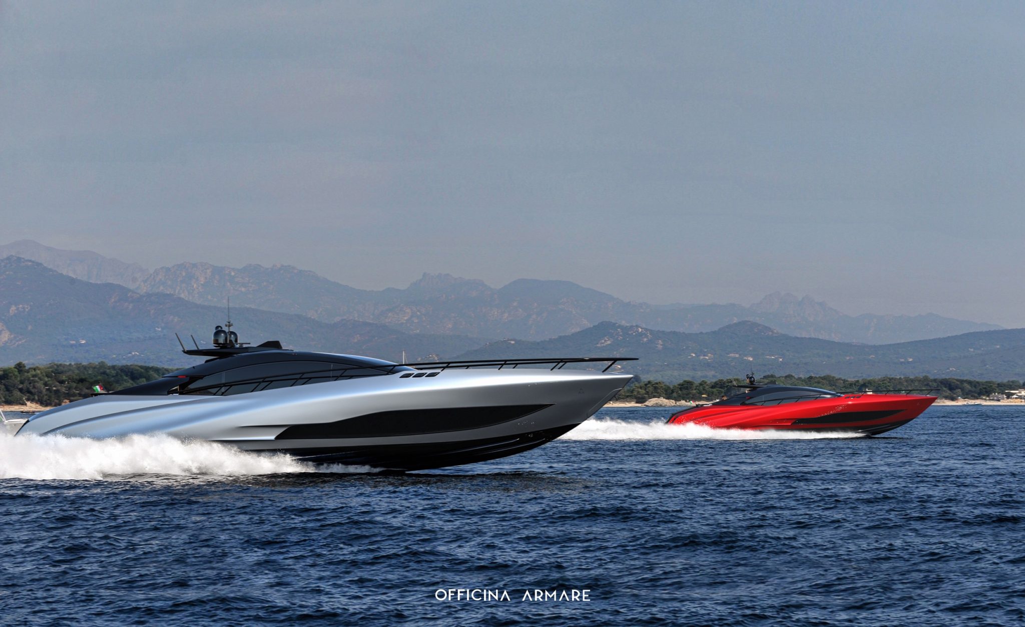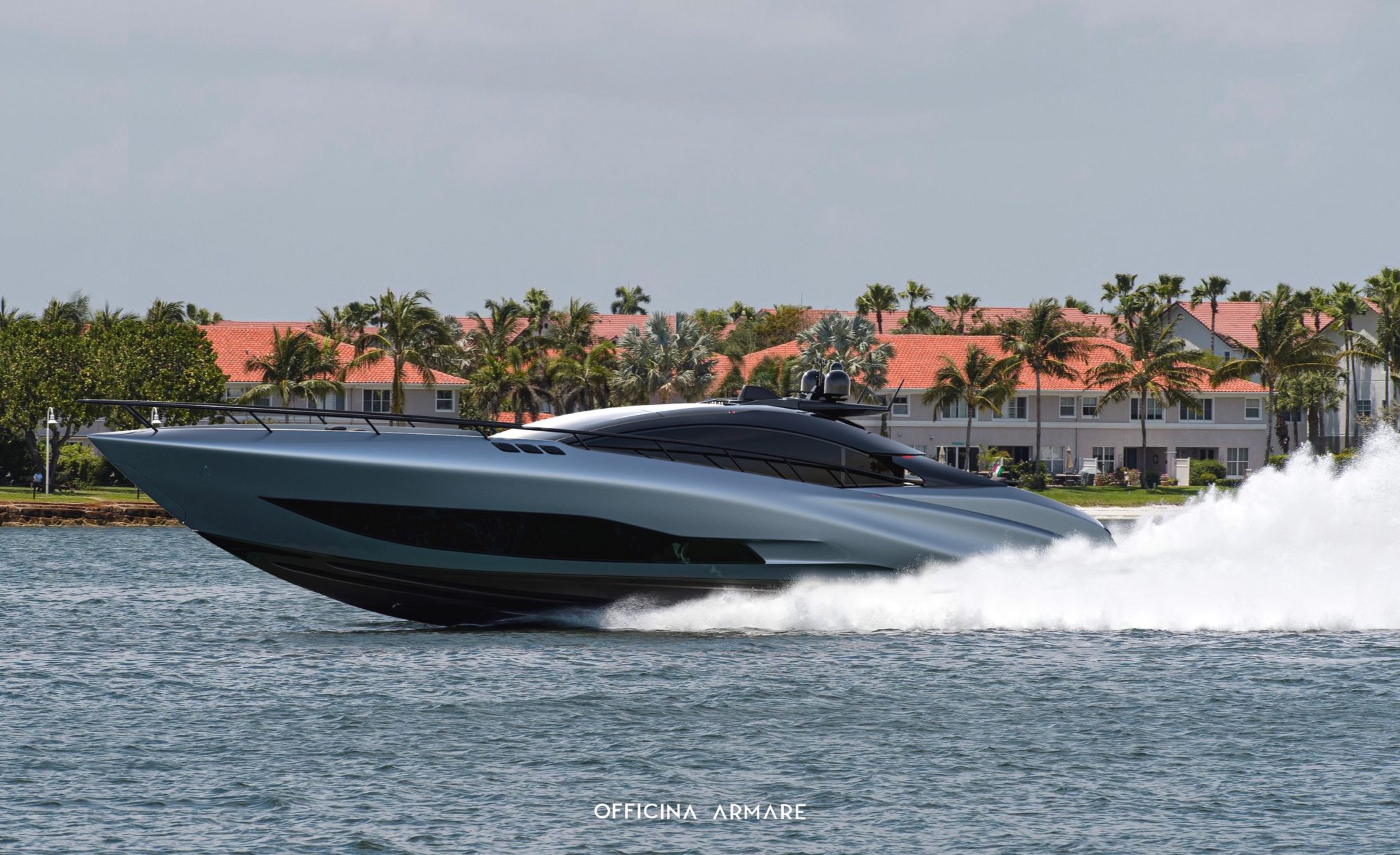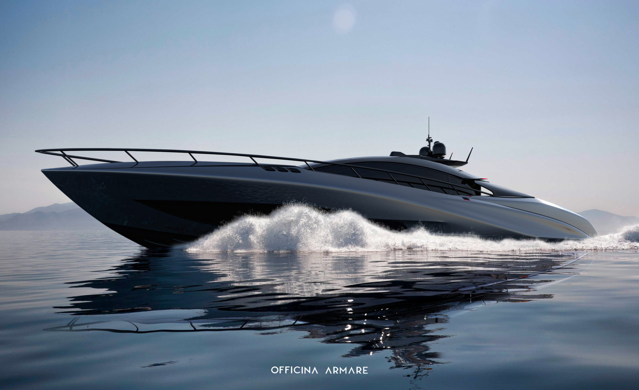 Officina Armare A88 Gransport praler af slank og sporty silhuet, hvilket yderligere understreges af den såkaldte "frossen” grå farve. Elegant og aggressiv færdiggør yachtens profil lige og en stor mængde udsatte kulfiber.