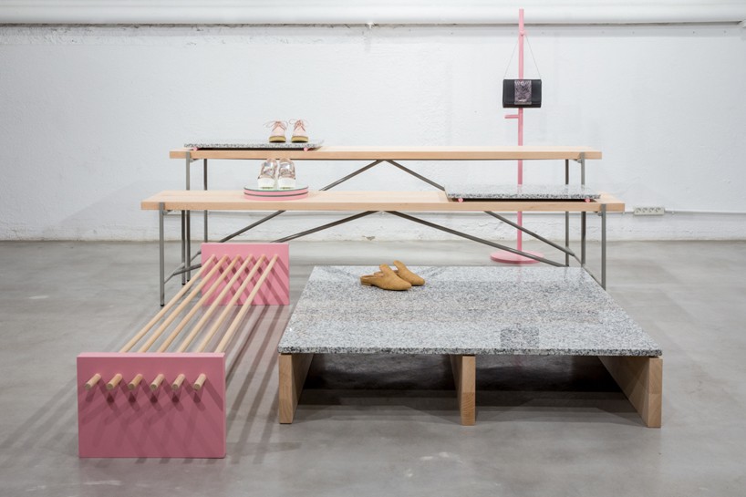 Pri ponudniku obutve in modnih dodatkov, trgovskem podjetju Mustang, imajo novo pohištvo, ki je njihovemu razstavnemu prostoru vsekakor dalo večjo vrednost in ga naredilo še privlačnejšega. Police, pladnji, klopi, obešalniki in miza, katerih čist grafični dizajn in prelepa barvna kombinacija sive (kamen), bež (les) in rožnate barve poudarja k trendom usmerjeno filozofijo modne znamke, so delo oblikovalske agencije Pelonio.