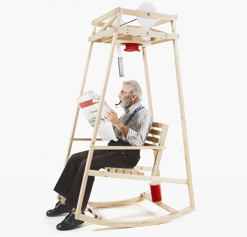 En gyngestol Rocking-Knit det er en gyngestol, ki nam med guganjem splete kapo. Kvačkanje v slogu babice nad glavo poteka s pomočjo kinetične energije, ki se ustvarja z zibanjem, to pa s pridom koristi poseben mehanizma, ki počasi, a vztrajno plete zimsko pokrivalo iz volne.