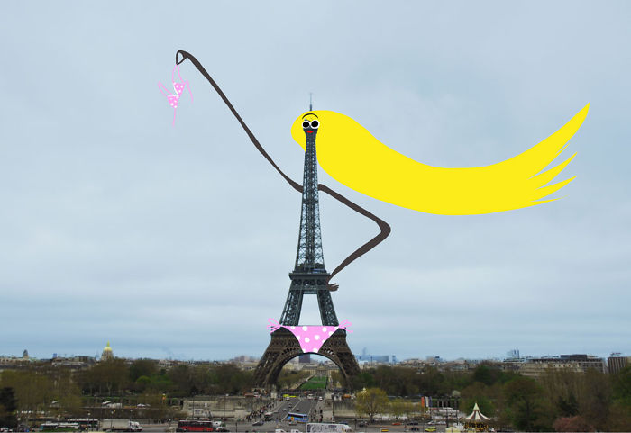 Sandrine Estrade Boulet je ilustratorka, ki ji domišljije ne manjka. A svojih idej ne preliva na bel list papirja ali platno, ampak za motiv jemlje fotografije pariških ulic, ki jih dodela s podobami in idejami iz svoje fantasi. Rezultat so igrive in posrečene kombinacije, ki prikazujejo Pariz v povsem novi luči. Preveri, kako je običajen jašek postal parfum, stožec čarovnica na metli, šop trave na pločniku navijačica itd.