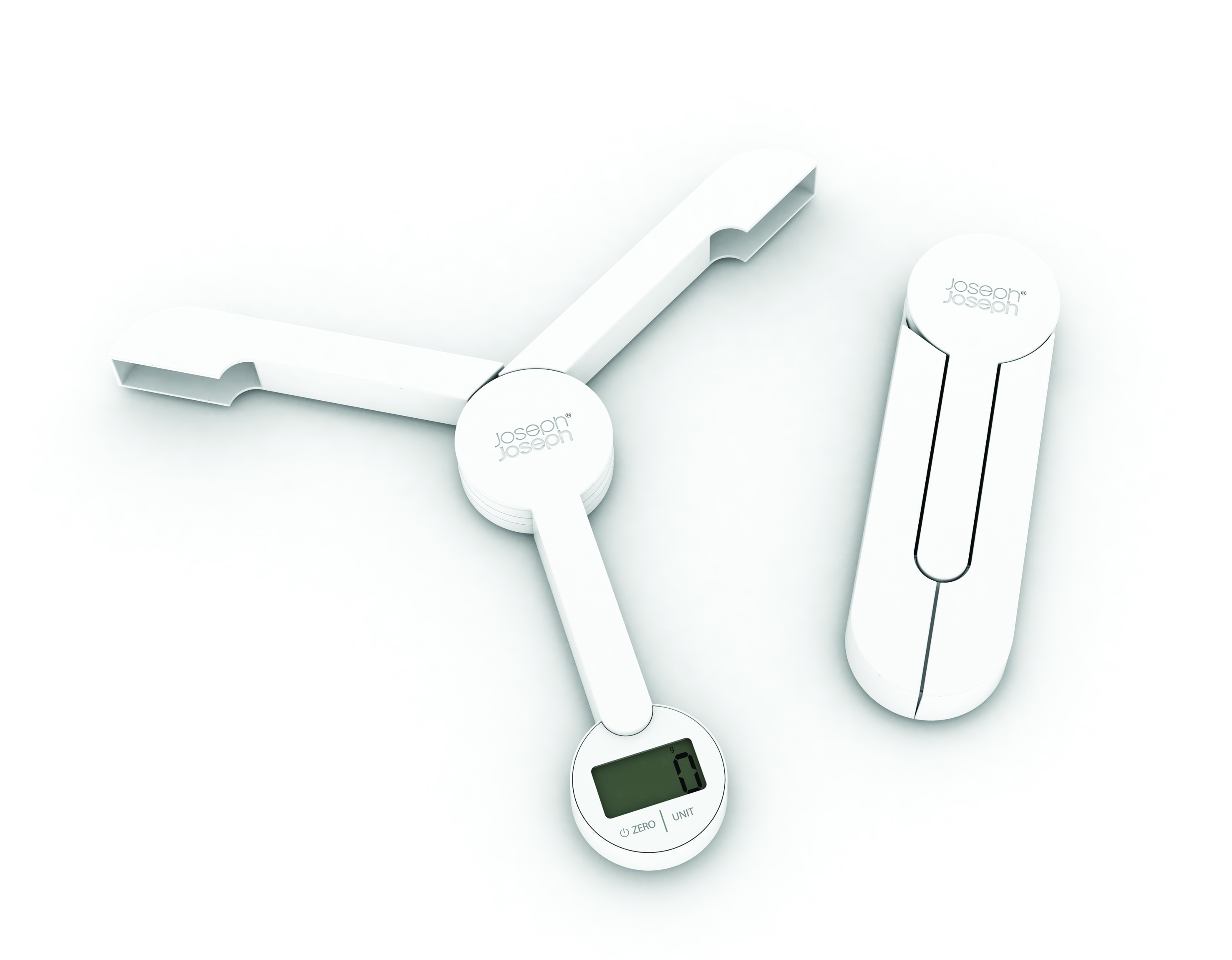 Fordi ethvert køkken har brug for et en køkkenvægt, og fordi kun disse normalt er store og uinteressante, er vi i butikkerne Tusind og en gaver fundet en interessant lille køkkenvægt. Sammenfoldelig digital vægt mærke Joseph Joseph bringer et nyt koncept med opbevaring af køkkenredskaber til vores køkken. De åbne arme giver en stabil base for vores containere, men når de er lukket, giver de beskyttelse til LCD-skærmen og berøringsfølsomme kontrolknapper. Vægten har en automatisk sluk-funktion og tillader vejning i forskellige måleenheder.