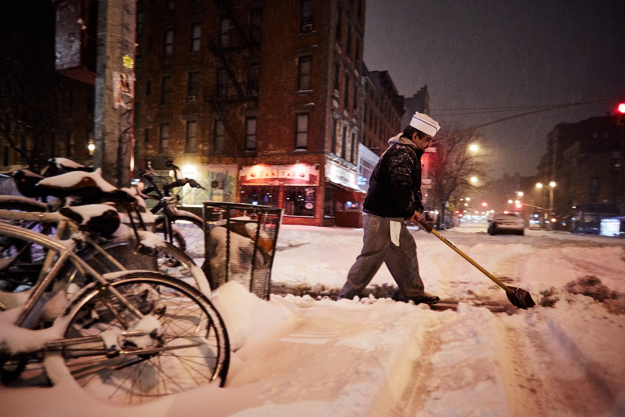 Se billeder af New Yorks snedækkede gader om natten i vores fotogalleri.