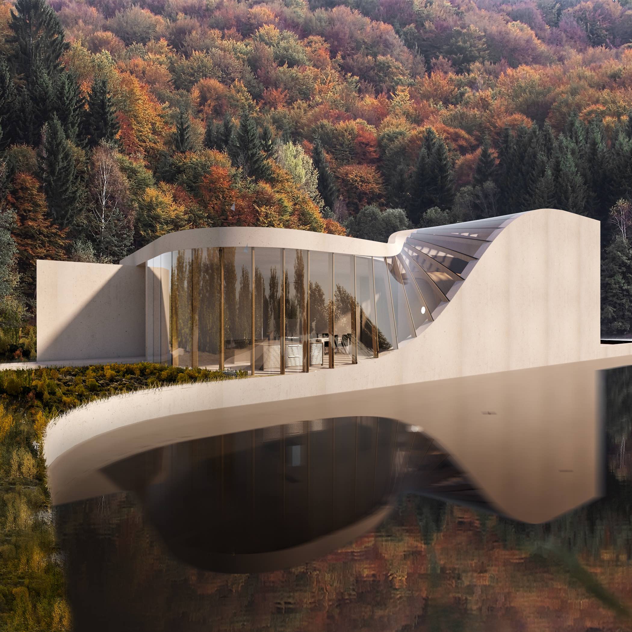 Skabere er inspirationen, når man designer et hus Lake House findes i det omkringliggende område – dette er tydeligt især når man ser på buet glasfacade, som udtrykker en direkte forbindelse med det ydre miljø og lader naturligt lys trænge ind i de indre rum.