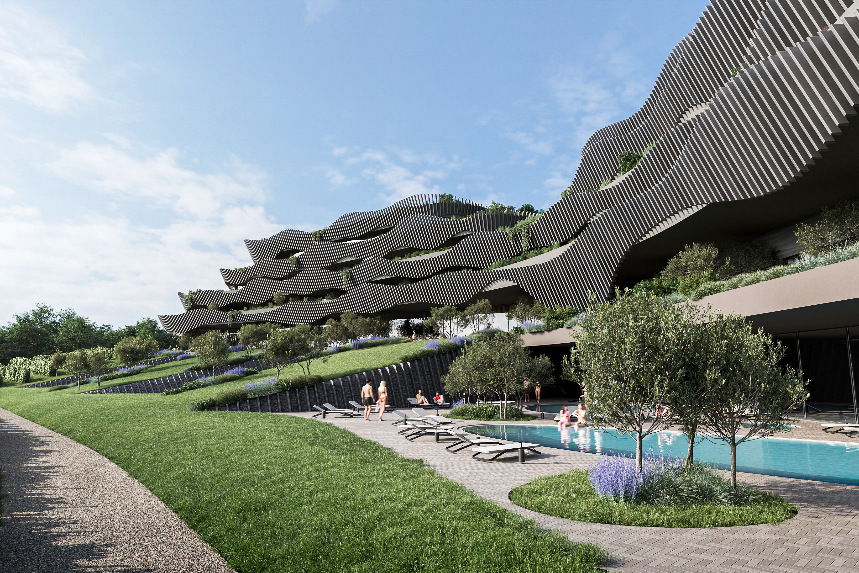 De forsøgte at placere den så upåfaldende som muligt i det givne terræn og smelte den sammen med bakkens hældning. Til dette formål er det planlagt at fjerne de øverste niveauer af bakken, som vil blive erstattet af etagerne i den nyoprettede bygning.