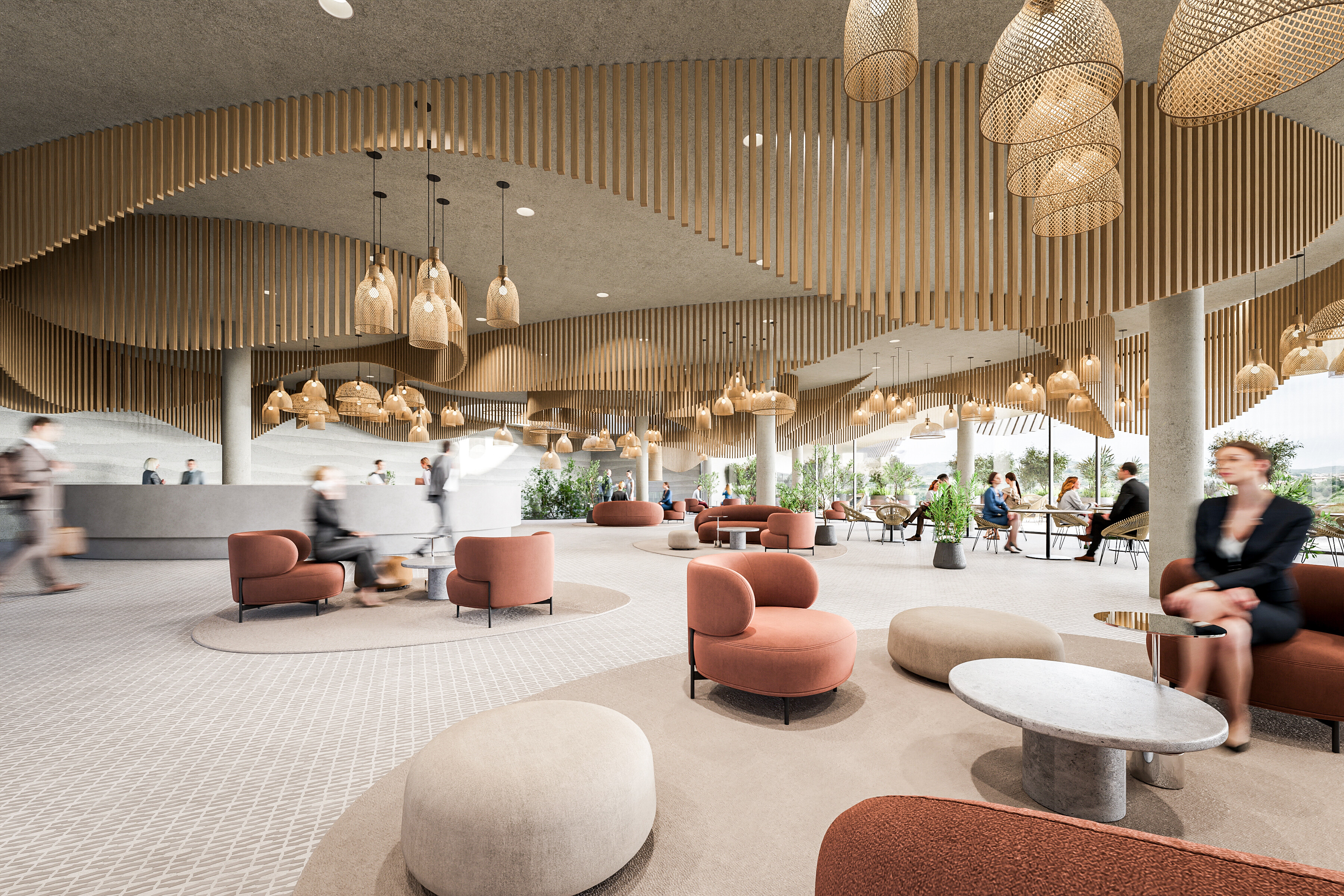 Arkitekterne forestillede sig brugen af naturlige materialer, og farvespektret skulle også tage udgangspunkt i omgivelsernes naturlige nuancer. Fra jordens farve til brug af træ og natursten. Det grønne tag skal få bygningen til at skille sig endnu mindre ud i rummet og forbinde den nye bygning med den omgivende natur.