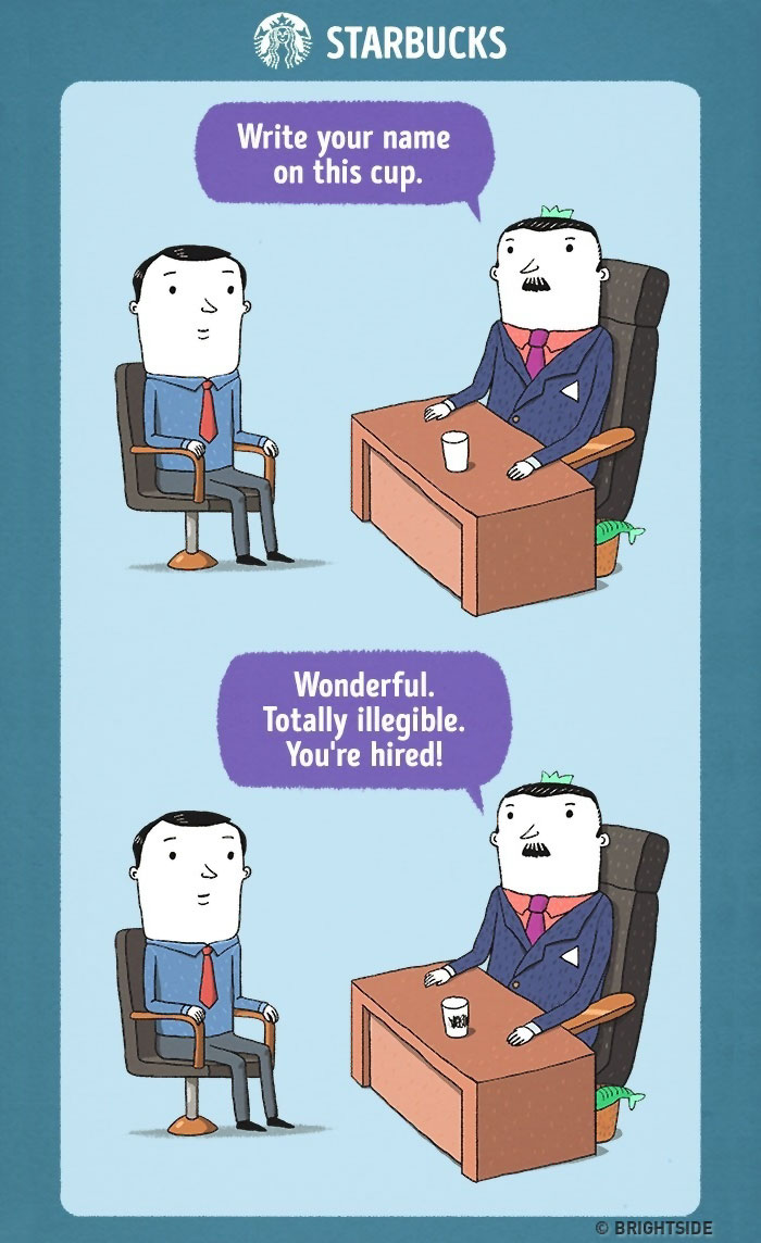 Hver stor virksomhed har sine egne karakteristika og stereotyper forbundet med den. Hashtagget er uløseligt forbundet med det sociale netværk Twitter, Ikea til samlingen af møbler, Starbucks er kendt for at skrive navnene på sine kunder på gryder... Leonid Khan legede med stereotyper om verdensberømte virksomheder og inkluderede dem i sine illustrationer på emnet jobsamtaler.
