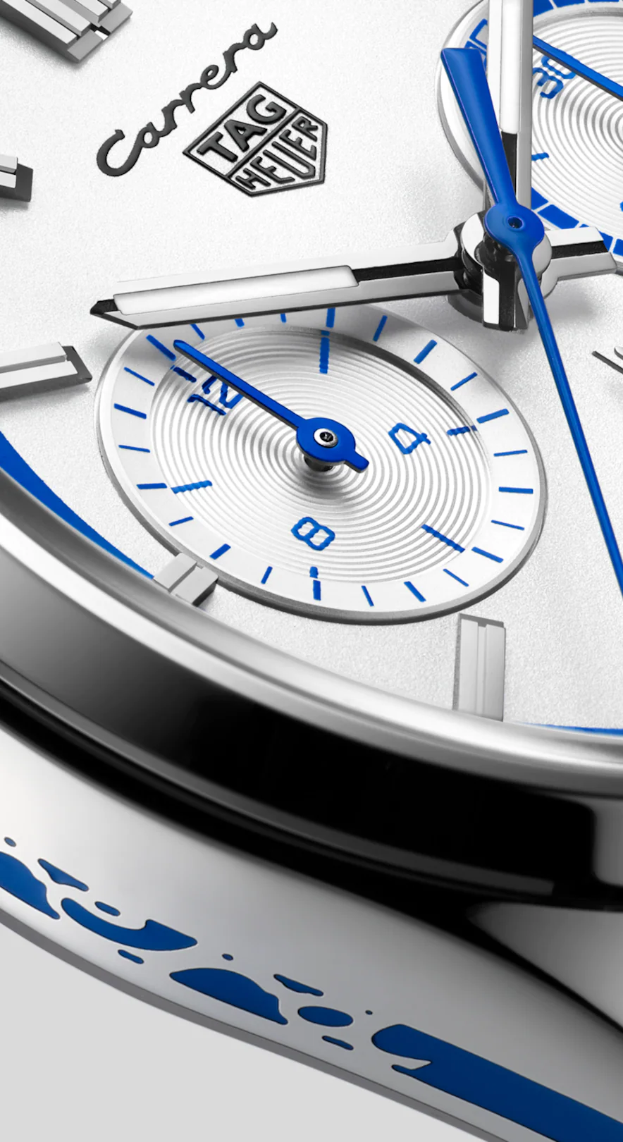 Tag Heuer Carrera X Porsche RS 2.7 er en hyldest fra den schweiziske urmager til det tyske bilikon. Den har et ur 42 mm en stor urkasse i poleret stål med en urskive, der bærer den nu traditionelle blå og hvide farvekombination. De berømte Carrera-bogstaver kan findes på siden af urkassen og lærredsremmen på uret.