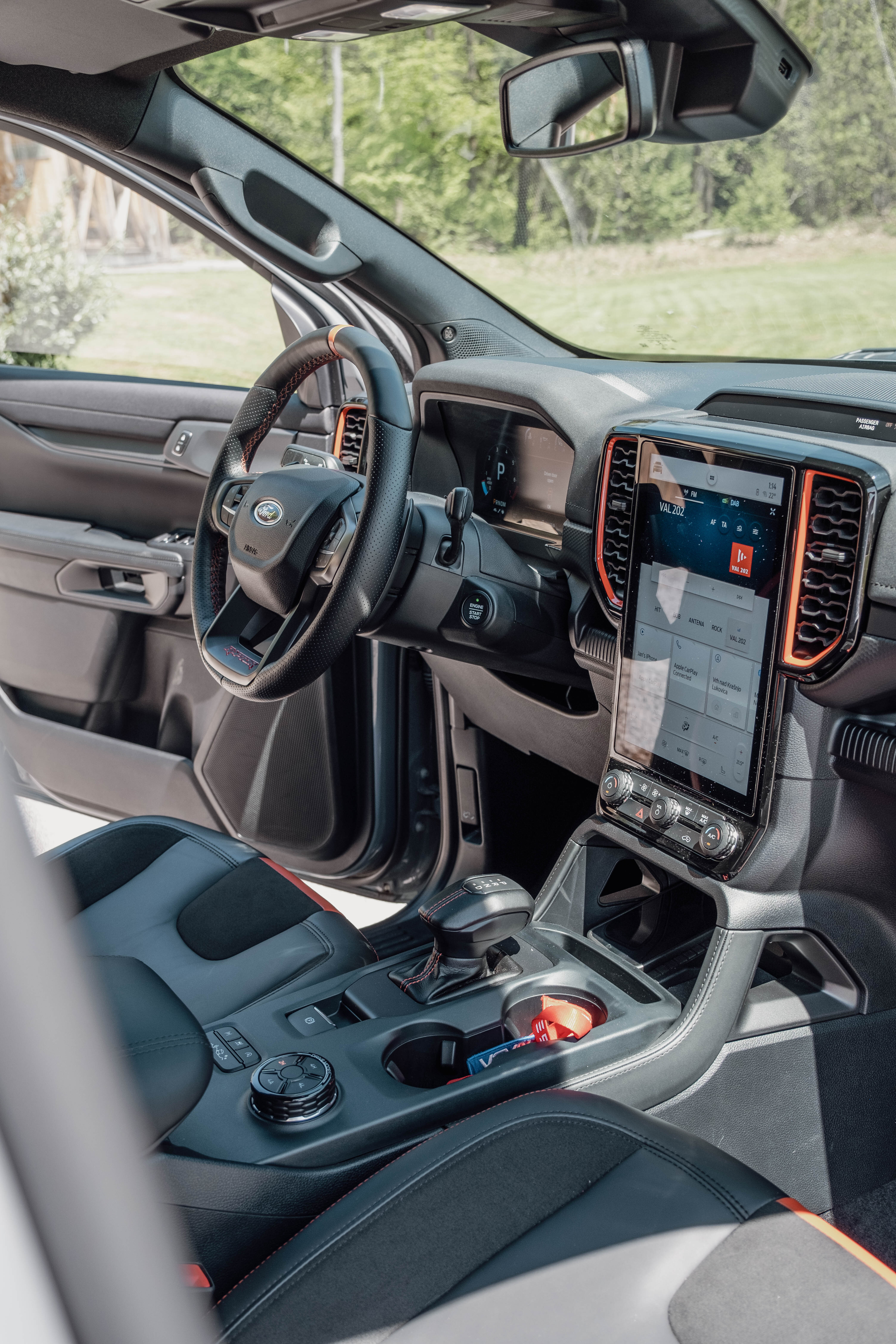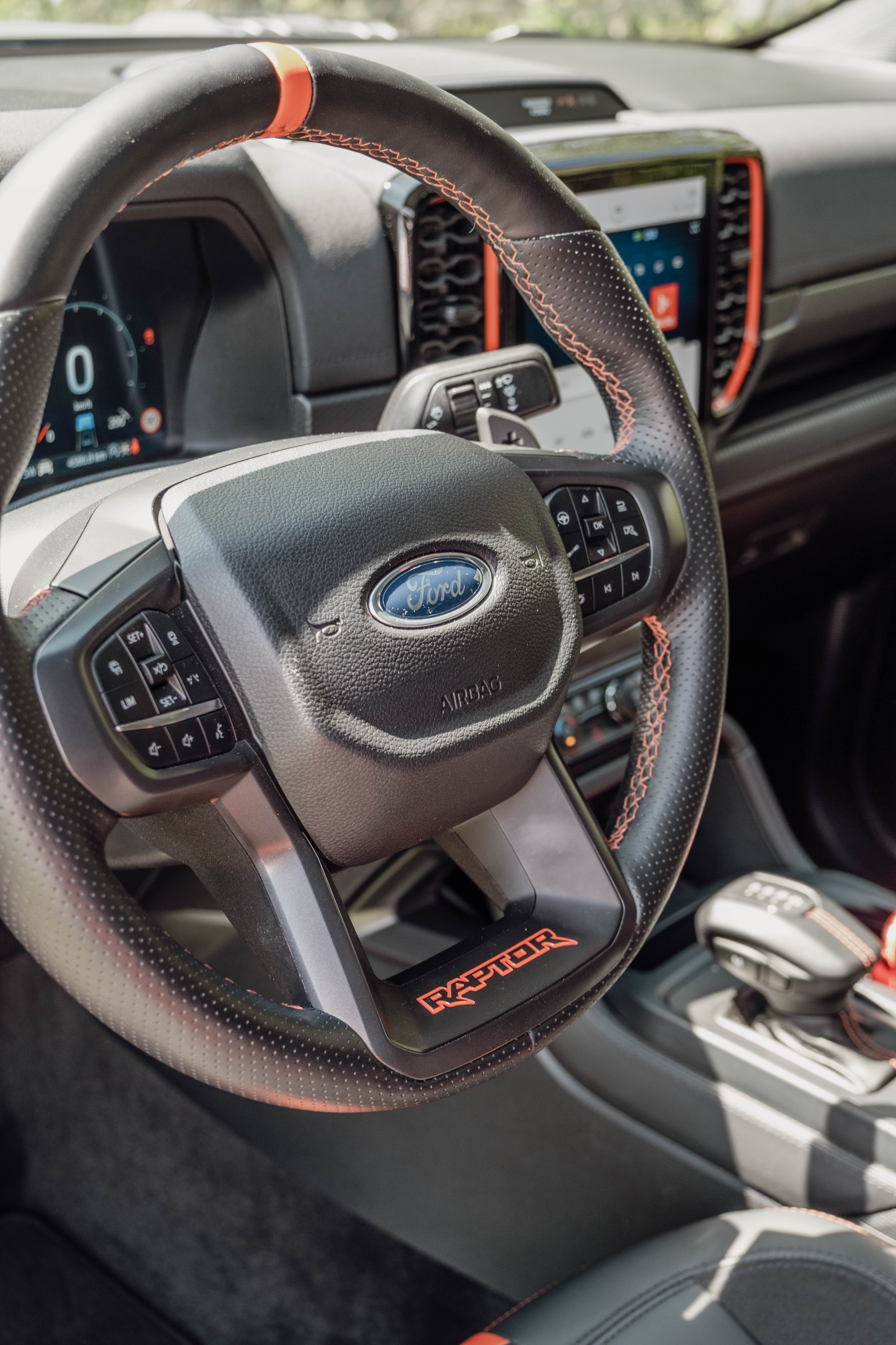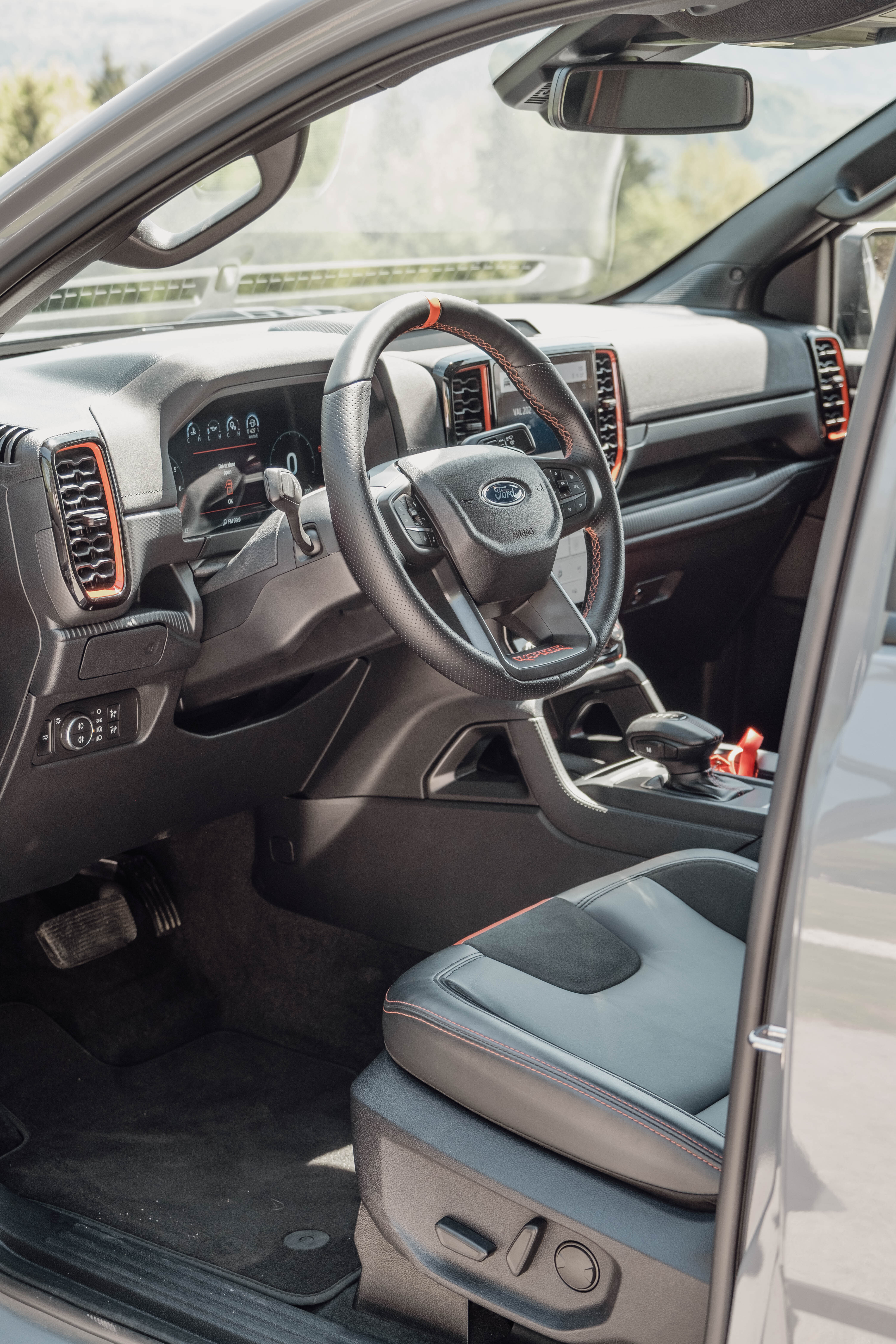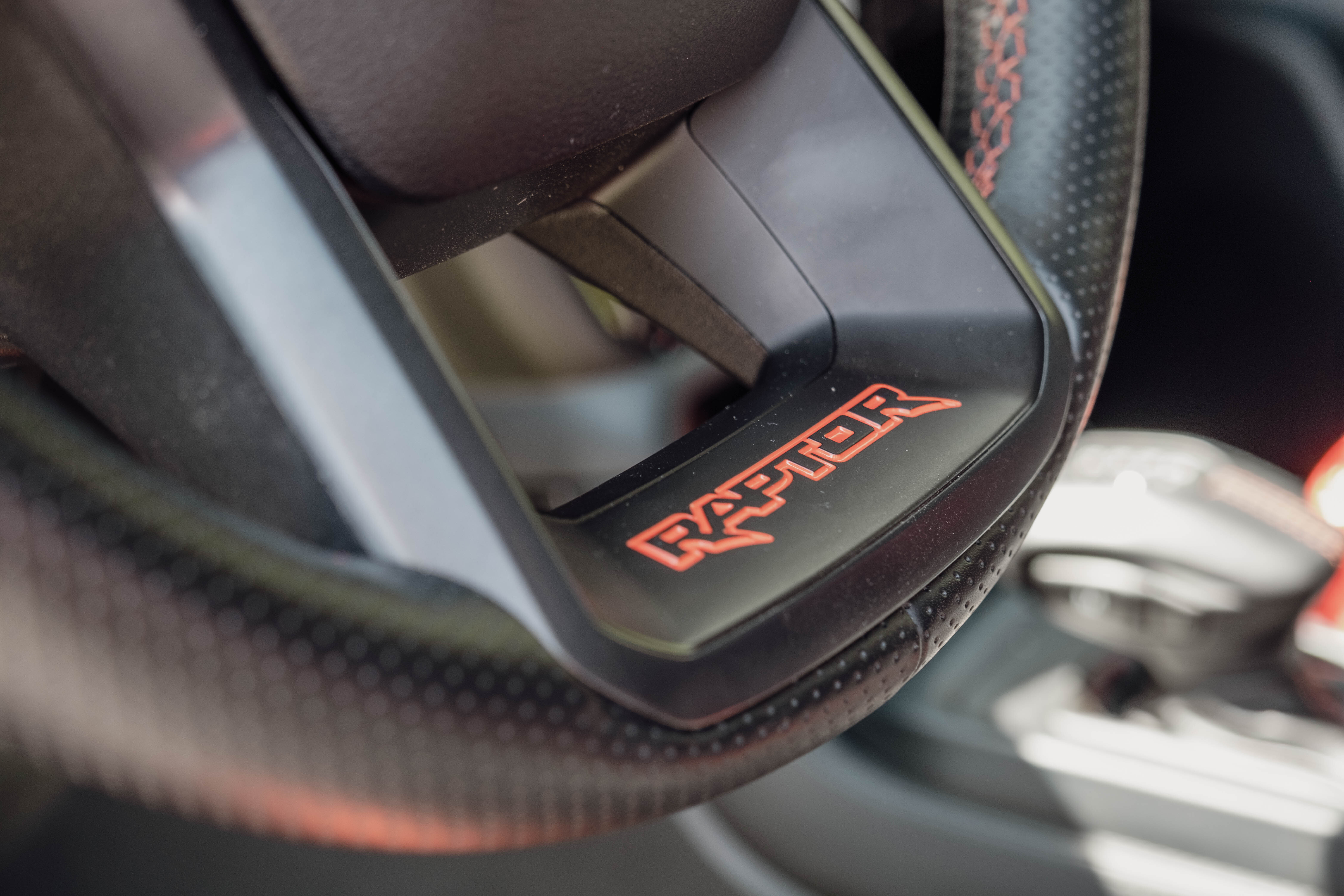 Inde i Ranger Raptors kabine er der helt nye jagerfly-inspirerede sportssæder, der giver større komfort og støtte under hurtige sving. Med orange, for mig røde, accenter og ambient belysning udstråler interiøret en livlig offroad-atmosfære.