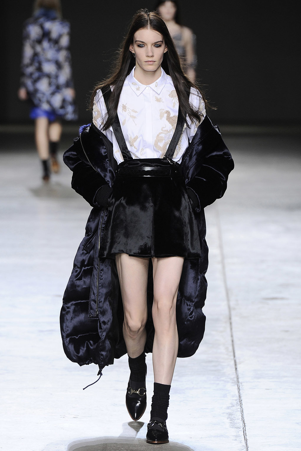 Spogledujeta se prefinjena ženska eleganca v obliki dolgih, mehko padajočih oblek z detajli čipke, čutnih zgornjih delov oblačil, velikih plaščev iz ovčje kože, mehkih prevelikih pletenin, ki objemajo telo. Na drugi strani jim delajo družbo robati, ostri, kosi, ki so njihovo diametralno nasprotje. Puhovke v metalnih odtenkih, ostro krojeni plašči, ki odsevajo strogost, elementi moške garderobe, usnjene jakne ter visoki škornji, ki dodajo ostrino. Kolekcija Topshop Unique, ki razkriva, da so tudi boyish dekleta čutna, je ovita v odtenke sive, modre, zelene, z redkimi barvnimi prebliski.