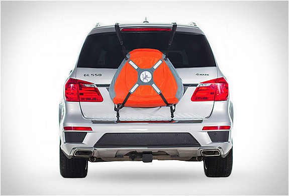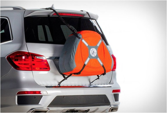 TrunkMonkey har "elefantskind" fordi det er Kevlar-forstærket materiale, og ved hjælp af den medfølgende luftpumpe, pustes op på to minutterDen er fastgjort bag på køretøjet, og når den ikke længere er nødvendig, pumpes luften ud med den samme pumpe, og cykelholderen opbevares i det tilhørende rum. pung. På platformen Kickstarter du kan få det til 110 euro, den første serie til 90 euro er allerede solgt.