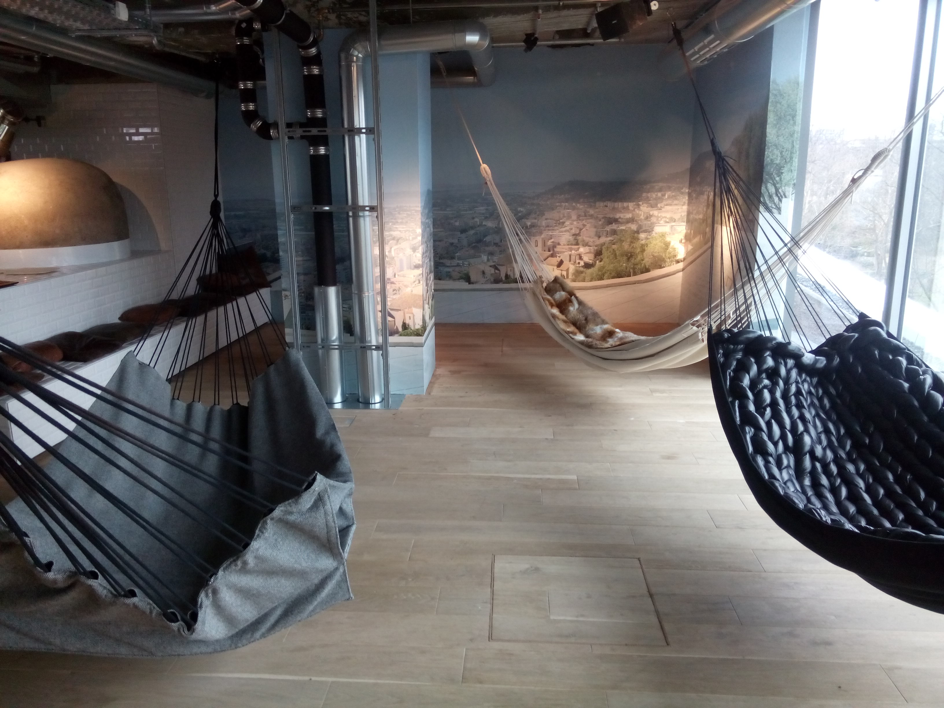 Dvojnost dizajna sovpada z dvojnostjo pogleda na eni strani na ograde z opicami in sloni berlinskega živalskega vrta ter na drugi na Breitscheidplatz in cerkev zgodovinske vrednosti Kaiser Wilhelm Memorial. Živa notranja vegetacija se tako, zahvaljujoč notranjemu oblikovalcu Wernerju Aisslingerju, odlično prepleta z urbano surovostjo, ustvarjajoč mehkobno domačnost v stiku z naravo.