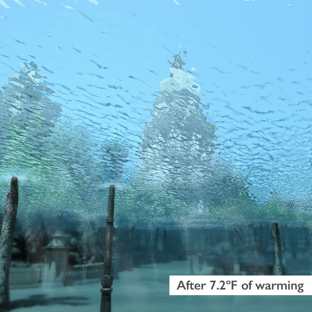 Globalno segrevanje v številkah je eno, a vizualni umetnik Nickolay Lamm nam posledice naraščanja temperatur in dvigovanja gladine oceanov prikaže plastično. Kakšne bi bile nekatere svetovne znamenitosti v slovitih mestih, če bi se povprečna temperatura ozračja do leta 2100 zvišala za 4,5 stopinje Celzija? Večina obmorskih krajev bi končala pod vodo in po znamenitih ulicah Londona, Ria de Janeira, Šanghaja … bi lahko le še veslali.