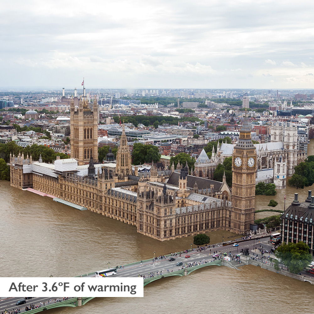 Globalno segrevanje v številkah je eno, a vizualni umetnik Nickolay Lamm nam posledice naraščanja temperatur in dvigovanja gladine oceanov prikaže plastično. Kakšne bi bile nekatere svetovne znamenitosti v slovitih mestih, če bi se povprečna temperatura ozračja do leta 2100 zvišala za 4,5 stopinje Celzija? Večina obmorskih krajev bi končala pod vodo in po znamenitih ulicah Londona, Ria de Janeira, Šanghaja … bi lahko le še veslali.