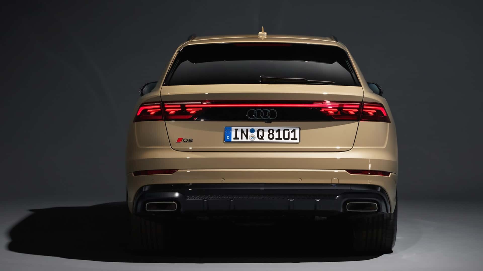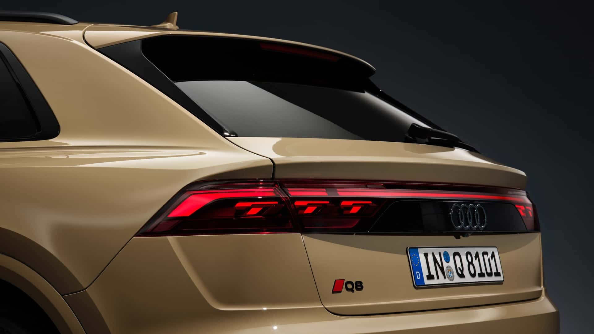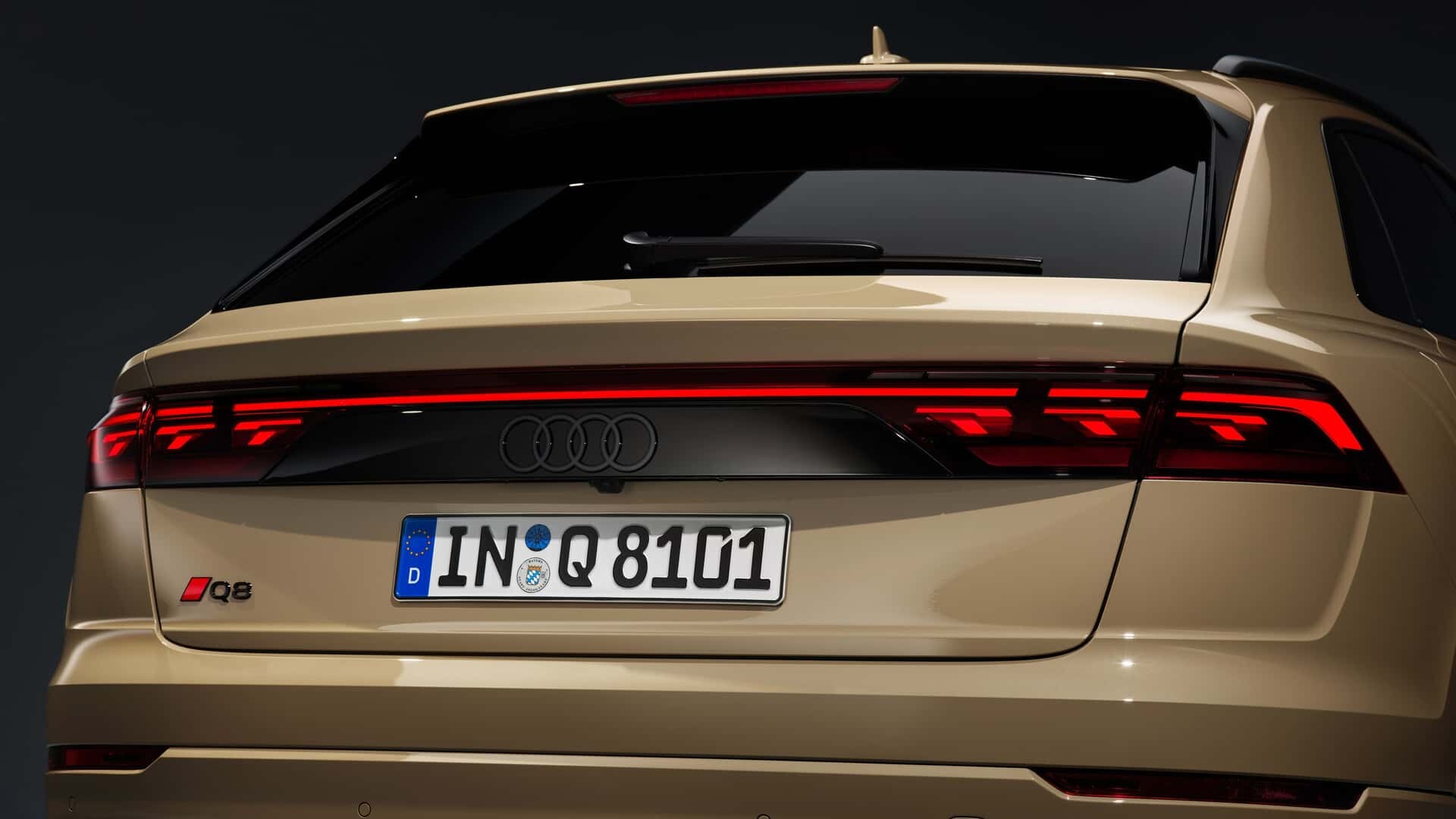 Am Heck führt Audi die OLED-Technologie in den Rücklichtern ein, die das Modell A8 und den kleineren Crossover Q5 nachahmen. Diese Lichter bieten neben den üblichen An- und Abfahrtssequenzen auch eine Sicherheitsfunktion. Wenn sich das Auto dem stehenden Q8 auf weniger als 2 Meter (6,6 Fuß) nähert, werden alle OLED-Elemente automatisch aktiviert.