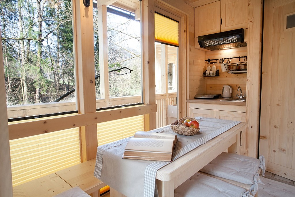 Idyllische Ferienhäuser liegen am Rande eines Weizenfeldes. Sie haben runde Fenster und große Eingangstüren aus Glas. Das Hauptbaumaterial sei Holz, das auch die materielle Basis der Möbel sei, sagten sie im Büro Landscape, doo, das sie leiten Tina Demšar Vreš und Grega Vres, wo die Häuser entworfen wurden. Das kompakte Interieur von Glamping Residenzen strahlt unendlich viel Wärme, Leichtigkeit und Zurückhaltung aus.