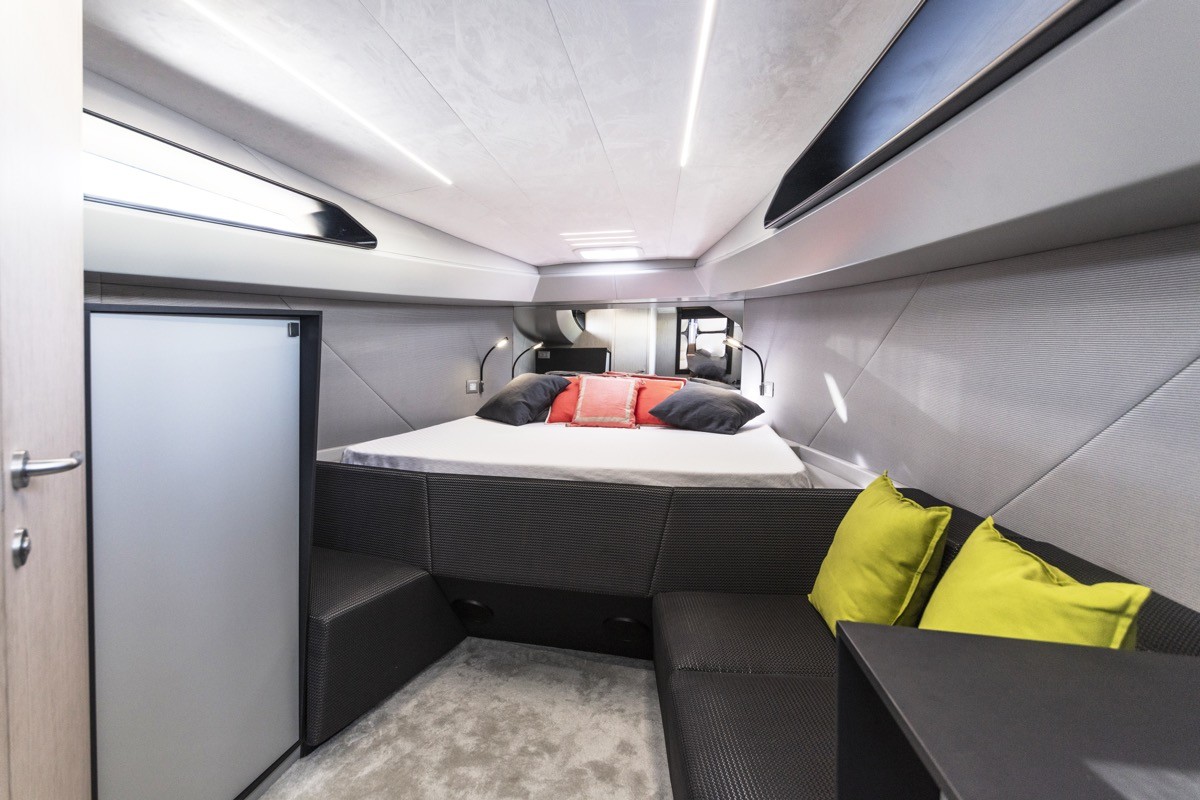 Anne 48 kann sich rühmen Kohlenstoff-Rumpf, welches ist hydrodynamisch unter Wasser u aerodynamisch über dem Wasser. Anvera trägt 48 zwei Motor mit po 550 PS, was ausreicht, um auf Touren zu kommen 55 Knoten. Hinten 14,5 Meter Wir haben ein langes Boot zur Verfügung 20 Quadratmeter Bereiche zum Ausruhen, Sonnenbaden und für andere Freizeitaktivitäten. Unter Deck finden wir einiges Kabine mit Badezimmer, das den Bedürfnissen für mehrtägige Ausflüge ans Meer entspricht.