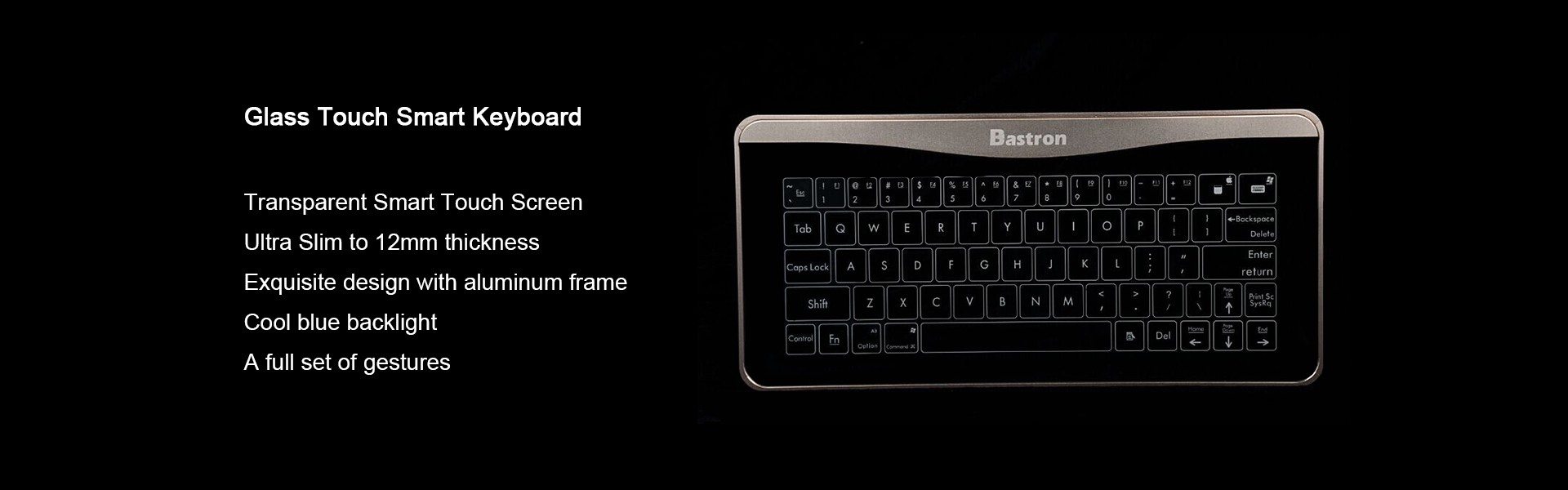 Absolut glatte Tastaturoberfläche Anfangs könnte es etwas seltsam und sogar unangenehm funktionieren, weil wir an die tatsächlichen Tasten und das Gefühl, das sie uns geben, gewöhnt sind. Aber wenn wir uns ziemlich schnell an Smartphones gewöhnt haben, werden wir uns auch an dieses gewöhnen. Nun ja, auch Bastron gehört zur Familie der Smart Devices. Mit dem Betriebssystem funktioniert das so Windows 10 sowie mit Mac. Die Glasoberfläche, die es beleuchtet LED-Licht, ist von einem Aluminiumrahmen umgeben. Einer der Vorteile einer völlig glatten Oberfläche ist natürlich, dass die Tasten sie werden nicht mehr schmutzig sein. Bastron ist wasserdichte TastaturSelbst wenn Sie es schmutzig machen, gibt es keine Probleme bei der Reinigung. Es ist außergewöhnlich dünn, da es nur misst 12 mm dick. Sie können es in zwei Farbversionen des Rahmens kaufen, nämlich golden und Silber-. Der Preis für das erste beträgt 80 Euro, und zum zweiten Mal ein paar Euro mehr.