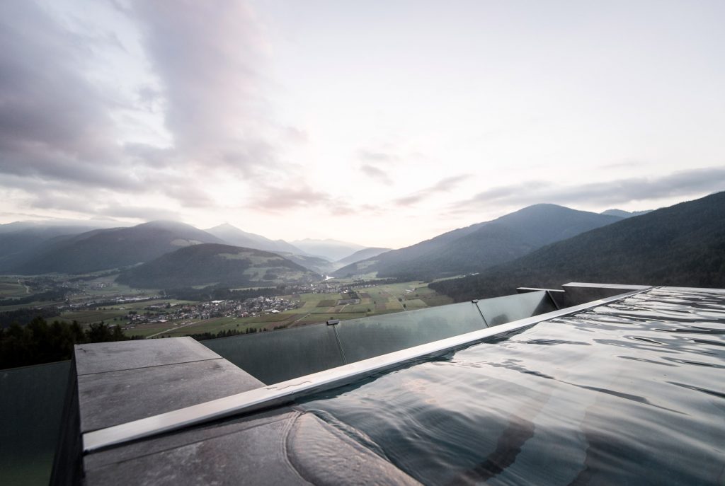 Arhitekturni studio NOAH ist für hotel Hubertus v italijanskem Kronplatzu, ki velja za priljubljeno pribežališče smučarjev in pohodnikov, izdelal previsno ploščad z zunanjim bazenom, ki ponuja prečudovit razgled na Dolomite. Kot da to ne bi bilo dovolj, ima 25-metrski bazen delno Glasboden, kjer med plavanjem dobite občutek, da lebdite v zraku.