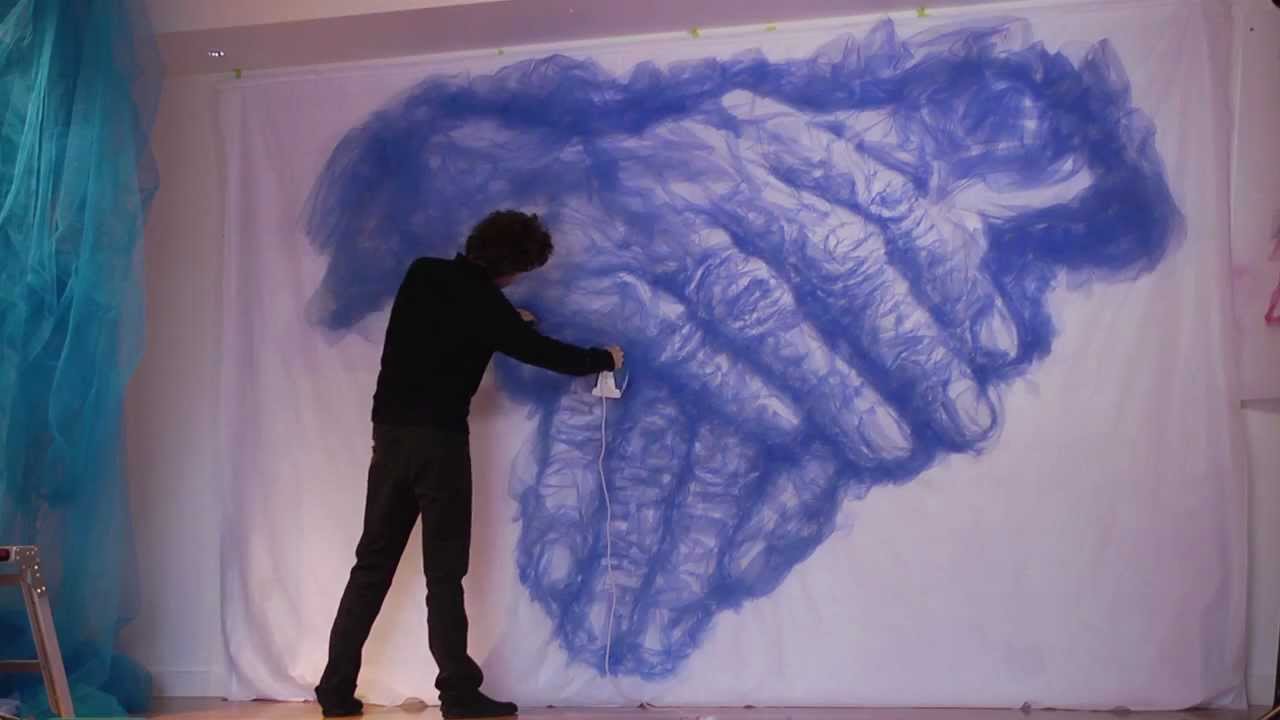Während die meisten Maler klassische Malutensilien wie Leinwand, Farben und Pinsel verwenden, kreiert Benjamin Shine mit Stoff und einem Bügeleisen. Erstere verwendet er als Leinwand, die zweite als Mittel zum Zeichnen von Strichen.