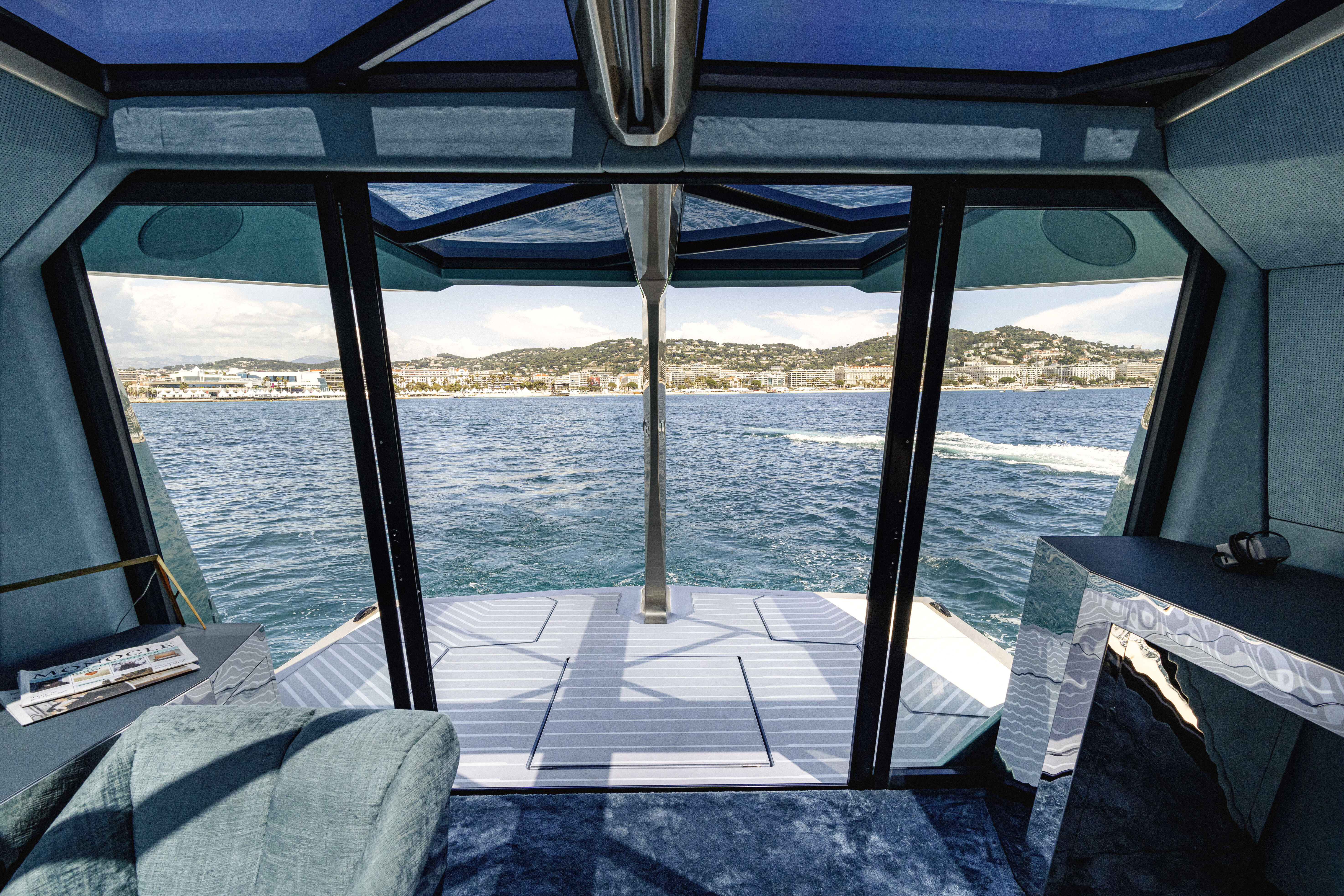 DAS SYMBOL Es ist auch ein sozialer Treffpunkt, der sich in jedem Hafen zu Hause fühlt. Durch die schrägen Glastüren gelangen Sie in den Salon, der mit seinen kunstvoll gestalteten Möbeln auf einem luxuriösen Teppich an Sie erinnert Kaleidoskop. Die um 360° drehbaren Sitze sind das Herzstück des Benutzererlebnisses. Alle wichtigen Funktionen – einschließlich des Tablet-Infotainmentsystems – stehen Ihnen jederzeit zur Verfügung.