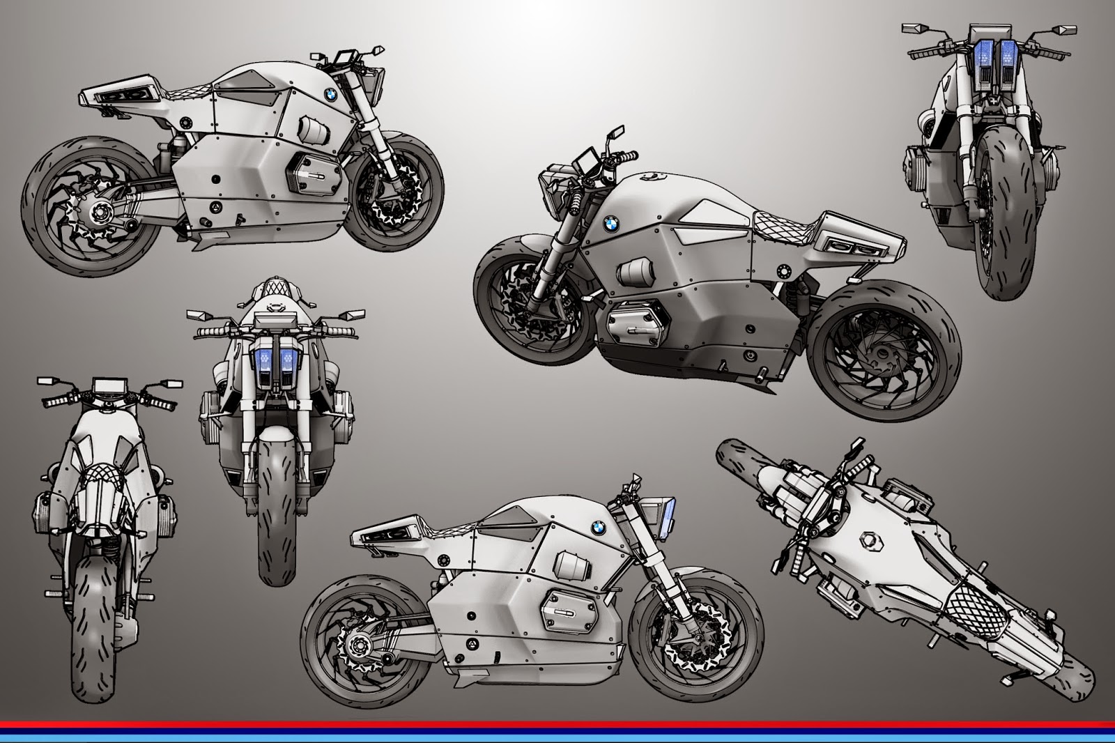 Motorradkonzepte Das BMW Urban Racer Concept ist eine Mischung aus Alt und Neu. Der Londoner 3D-Modellierer Jans Slapins, der auch einen modifizierten Ford und Lamborghini im Portfolio hat, meldete sich für die Studie an und präsentierte zuletzt das erwähnte elegante Zweirad mit weiß-blauem Propeller.